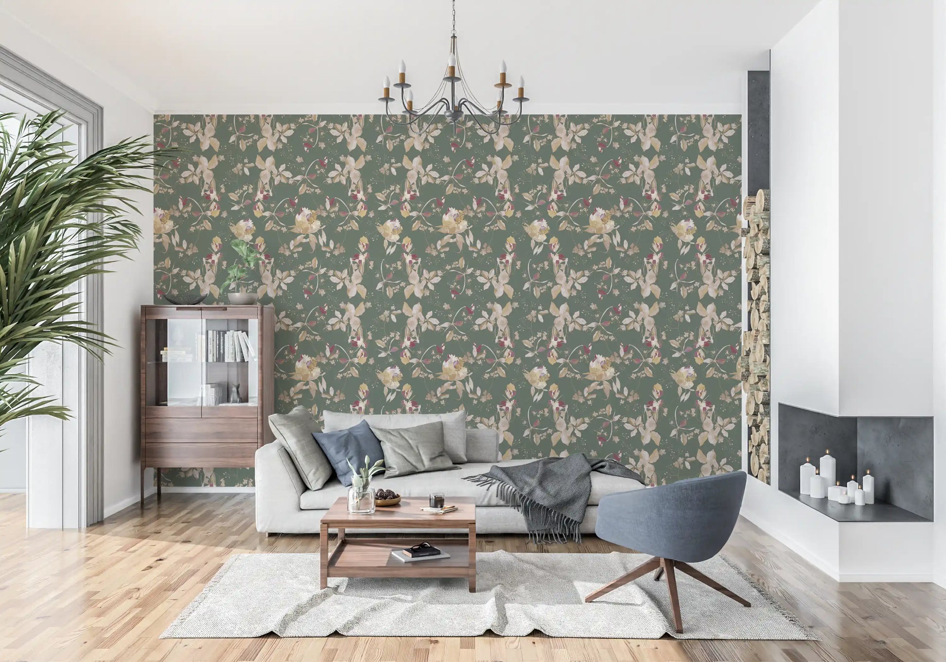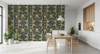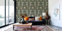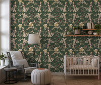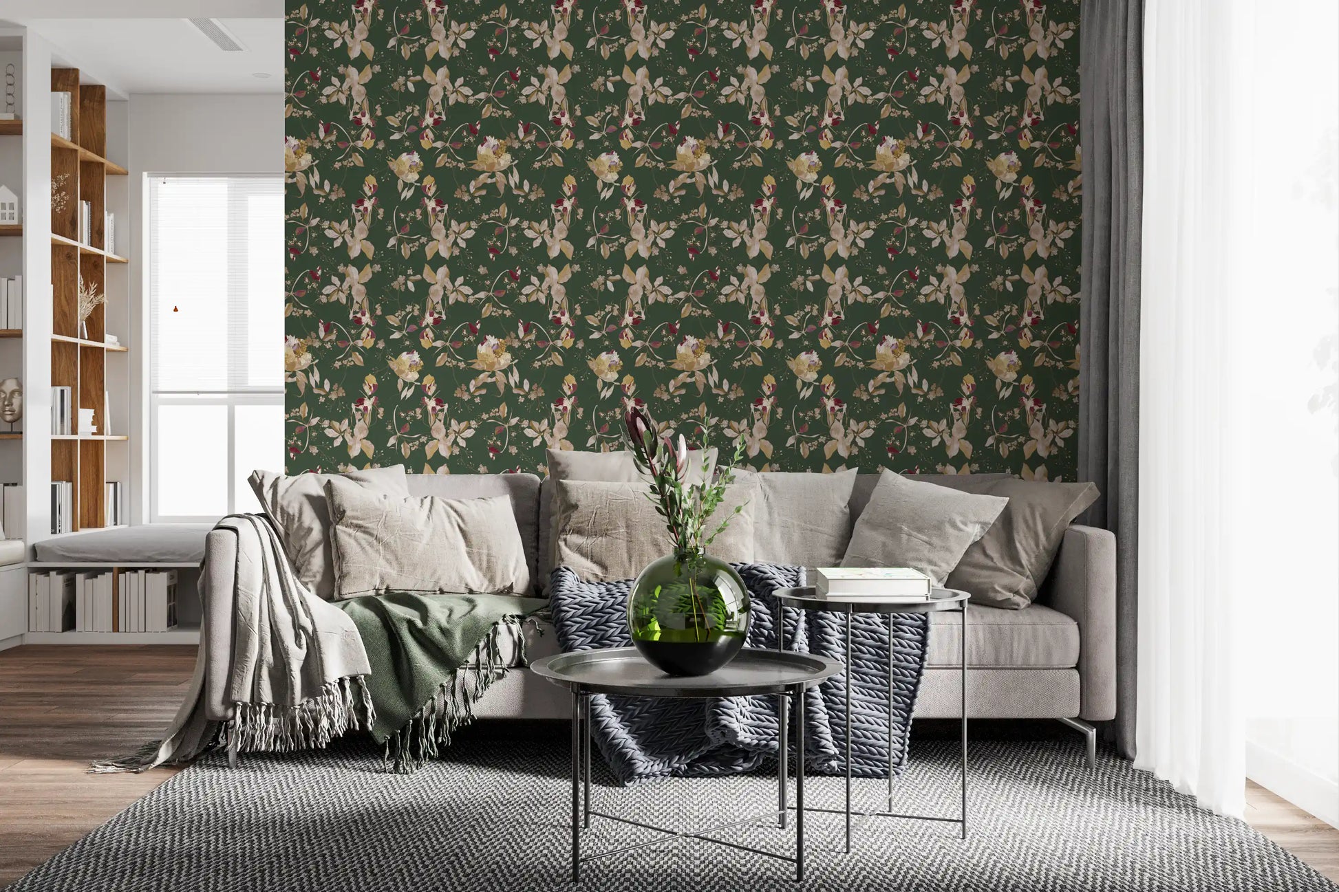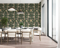 Immerse your living space in timeless elegance with our 'Antique Cream Botanical' wallcovering. This exquisite design weaves a captivating tapestry of nature's artistry against a deep, serene forest green backdrop. Delicate botanical forms unfurl across the surface, showcasing an opulent blend of antique cream and rich, burnished gold foliage. Intricate patterns and subtle textures within the leaves evoke the grandeur of bygone eras, while flourishes of deep burgundy leaves and clusters of delicate cream blossoms add depth and a touch of vintage allure. The harmonious interplay of muted yet luxurious tones creates an atmosphere of sophisticated tranquility. Perfect for transforming any room into a sanctuary of classic beauty, this captivating pattern offers a luxurious embrace of nature's enduring charm, adding an elevated touch of heritage and warmth to your walls.