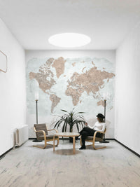 This wallpaper features a detailed watercolor world map rendered in soft, muted beige and gray tones. The antique aesthetic is enhanced by the slightly textured, hand-painted look of the map, creating a calming and sophisticated atmosphere. Perfect for a home office, study, or any space that needs a touch of refined elegance. The subtle color palette blends seamlessly with a variety of interior design styles, offering a timeless appeal and a sense of global exploration. Each country is clearly labeled, making it both visually appealing and functional.