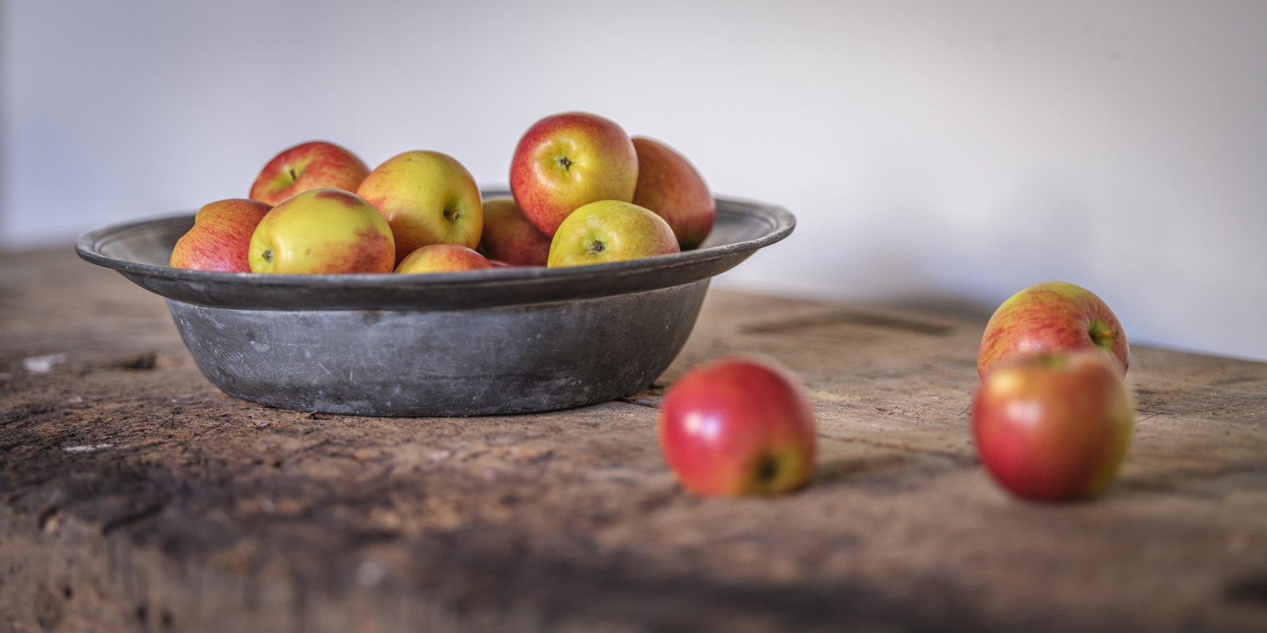 Bright apples in a simple metal bowl on rustic wood