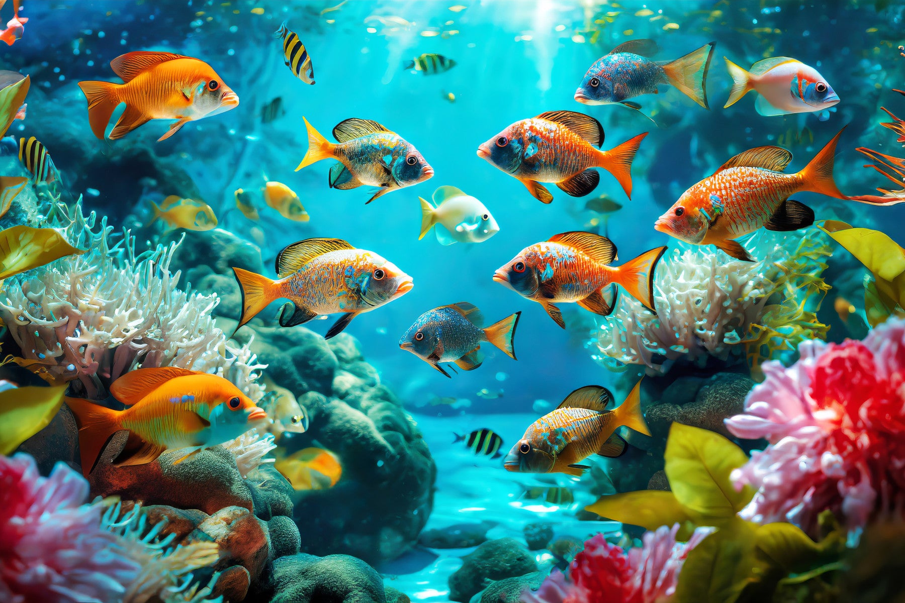 Immerse yourself in the captivating beauty of a lively coral reef with this stunning wallpaper. Vividly colored fish, in shades of orange, gold, and blue, gracefully glide through the clear turquoise waters. The interplay of light creates a dance of shimmering highlights on their scales, bringing a sense of movement and life to the scene. This calming yet vibrant image is perfect for creating a serene and inviting atmosphere in any room. It's like having a living aquarium right on your wall.