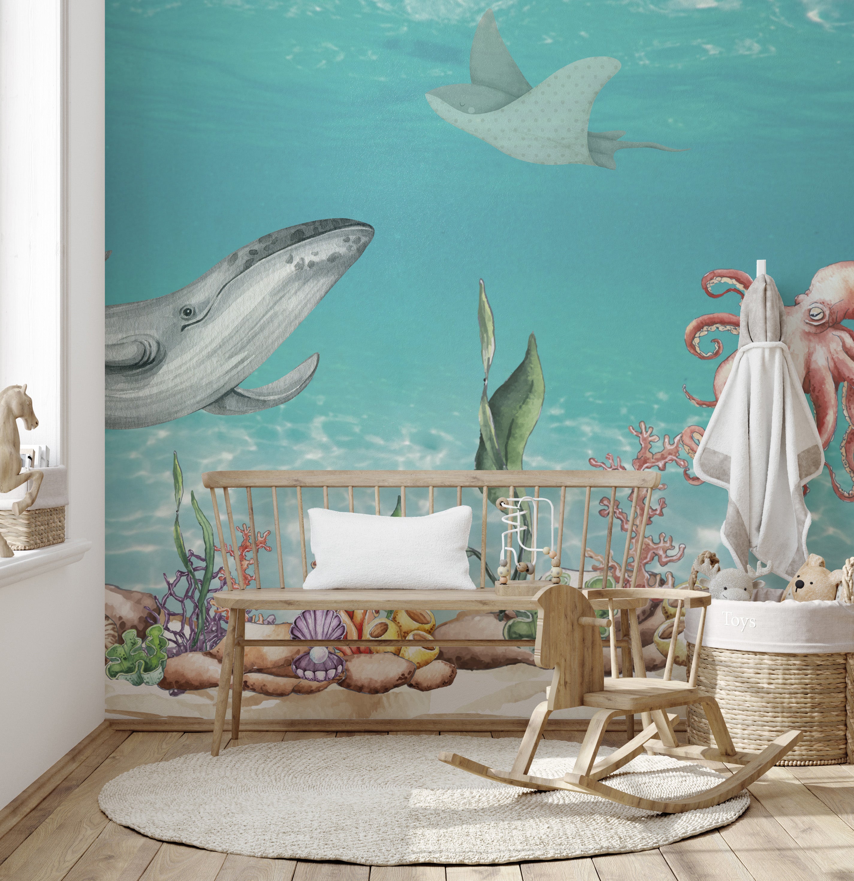 Discover the magic beneath the waves! Our aquatic harmony wall mural brings the ocean's vibrant ecosystem to your child's room. From the gentle whale to the curious octopus, this lively underwater scene sparks joy and curiosity. Every inch is designed to captivate and inspire young minds, turning their room into a haven of marine life. Watch your little ones marvel at the details of this enchanting seascape, a playground for imagination. This kids room wallpaper is not just a visual treat it's a gateway to learning and dreaming about the wonders of the ocean.