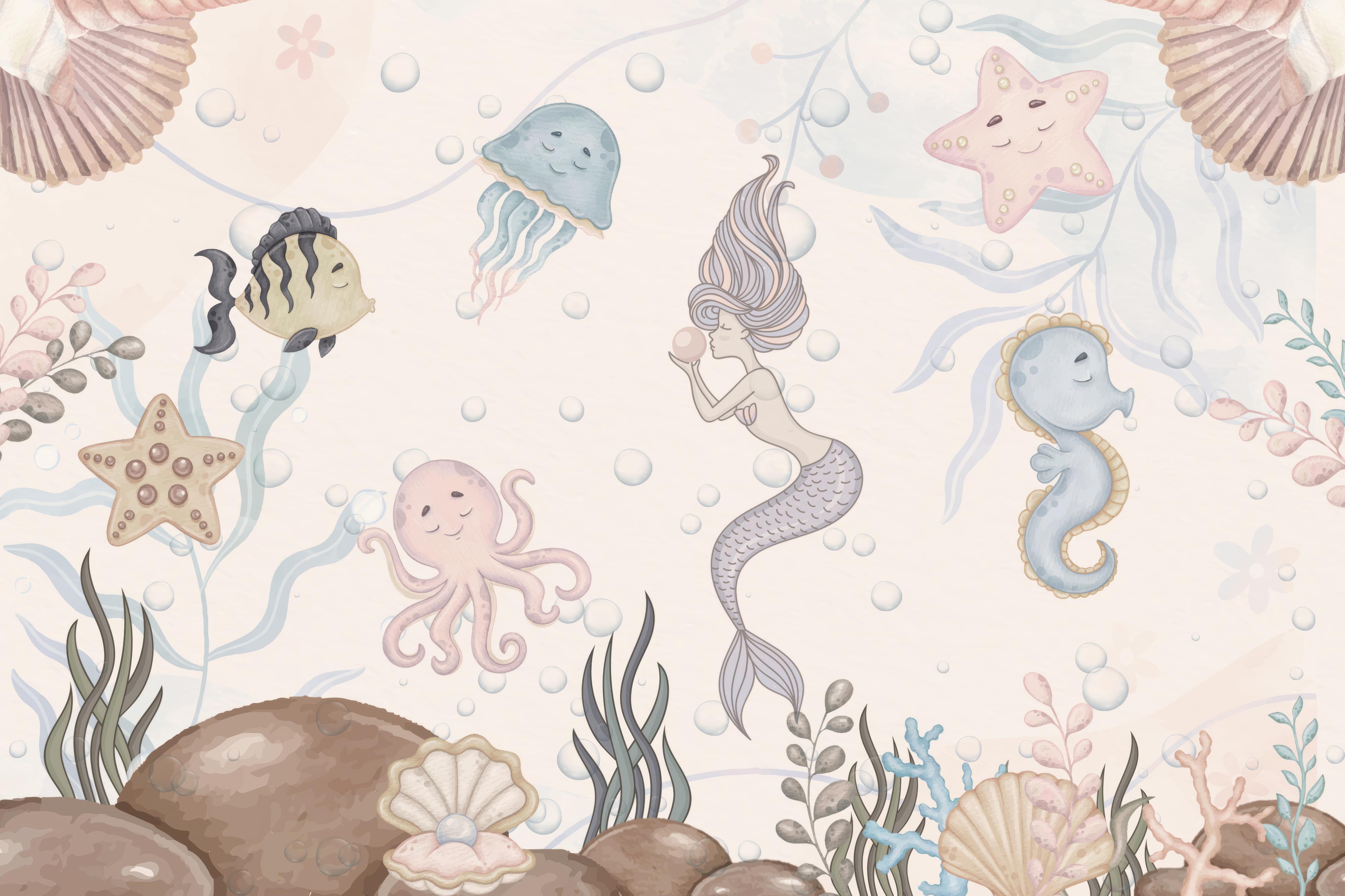 Create a seaside adventure right in your child's room with our nursery wallpaper for the aquatic playland wall mural. This vibrant mural is populated with delightful sea creatures and playful underwater scenes. From friendly octopuses to graceful mermaids and smiling starfish, this wallpaper brings the ocean's wonders to life. This setting not only entertains but also educates, as children learn about marine life in a fun and engaging way. It's designed to capture the imagination of young minds, making their room a favorite place for both play and rest. The detailed artwork in this mural offers a visual feast that helps in the cognitive development of children by enhancing their ability to recognize shapes and colors.