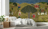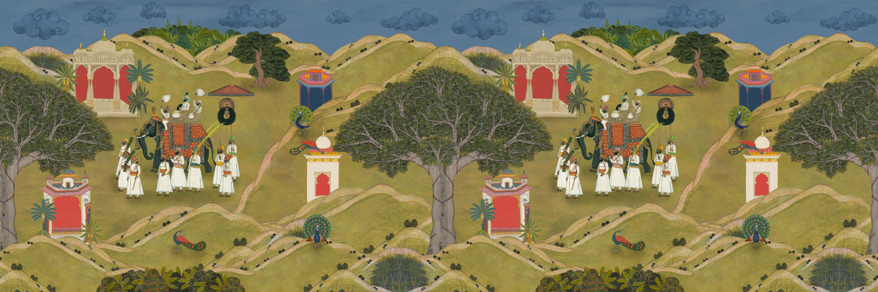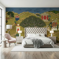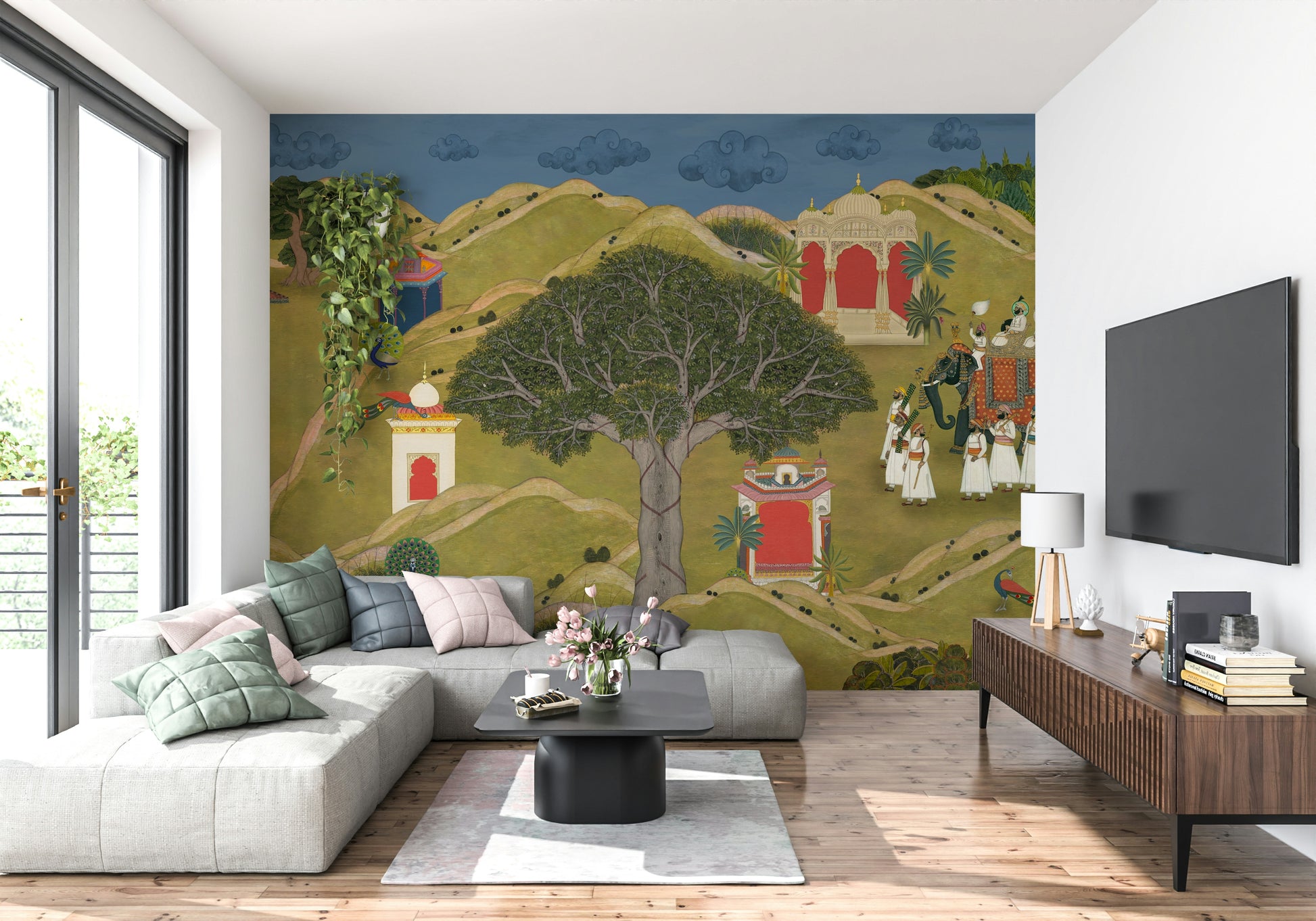 Step into the majestic landscape of 'Aravali Tales', a captivating wall covering that transports you to the heart of Rajasthan. This enchanting design depicts a vibrant procession winding through rolling hills, echoing the rich cultural heritage of the region. Elegant elephants adorned in regal attire carry dignitaries, while ornate pavilions and lush trees punctuate the idyllic scenery. The muted sky and earth tones create a sense of serenity, while the intricate details of the architecture and flora add depth and visual interest. With each glance, discover new nuances within this captivating panorama, a symphony of nature and tradition that adds a touch of regal elegance to any room. Immerse yourself in the timeless beauty of 'Aravali Tales' and let it narrate stories of a bygone era on your walls.