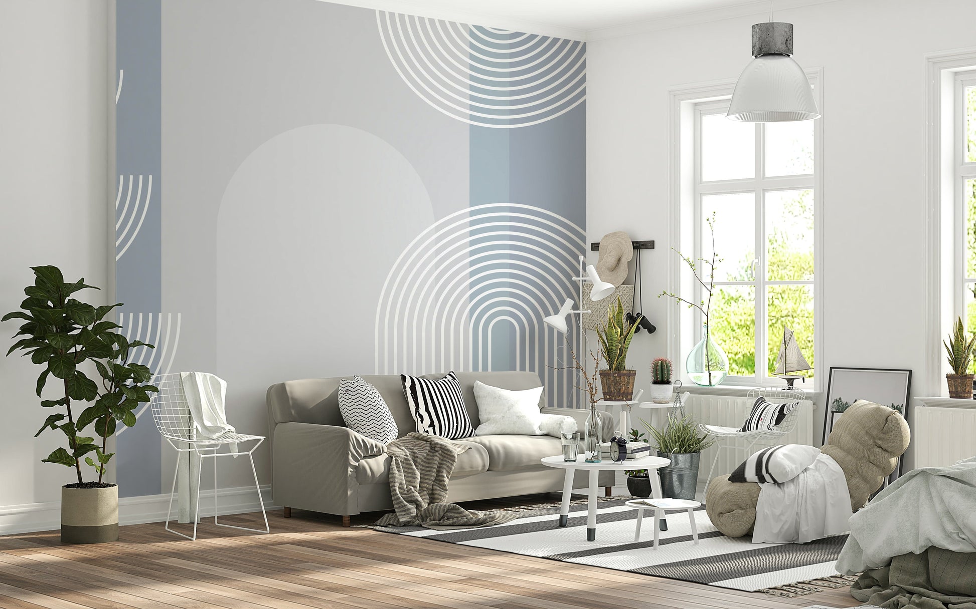This wallpaper for walls presents a modern abstract pattern with geometric shapes. Arcs and circles combine with soft hues of grey and blue. This design adds visual interest and a calm vibe to a room. Ideal for a living room or bedroom, it complements both minimalist and Scandinavian interiors. It also brightens hallways and entryways.