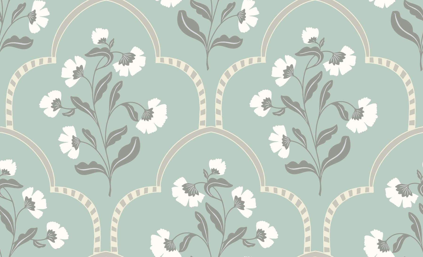 Arched Floral Elegance wallpaper, sage green curved geometric design.