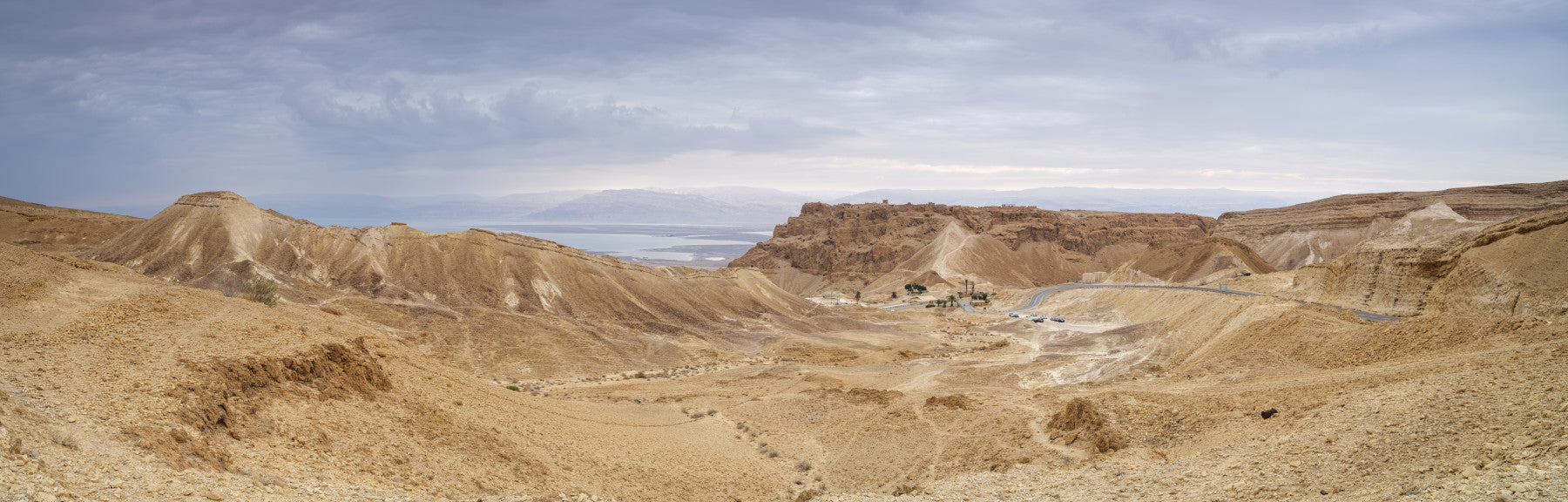 Panoramic view of dry terrain, Masada-like fort, Arid Majesty Desert Landscape Design.