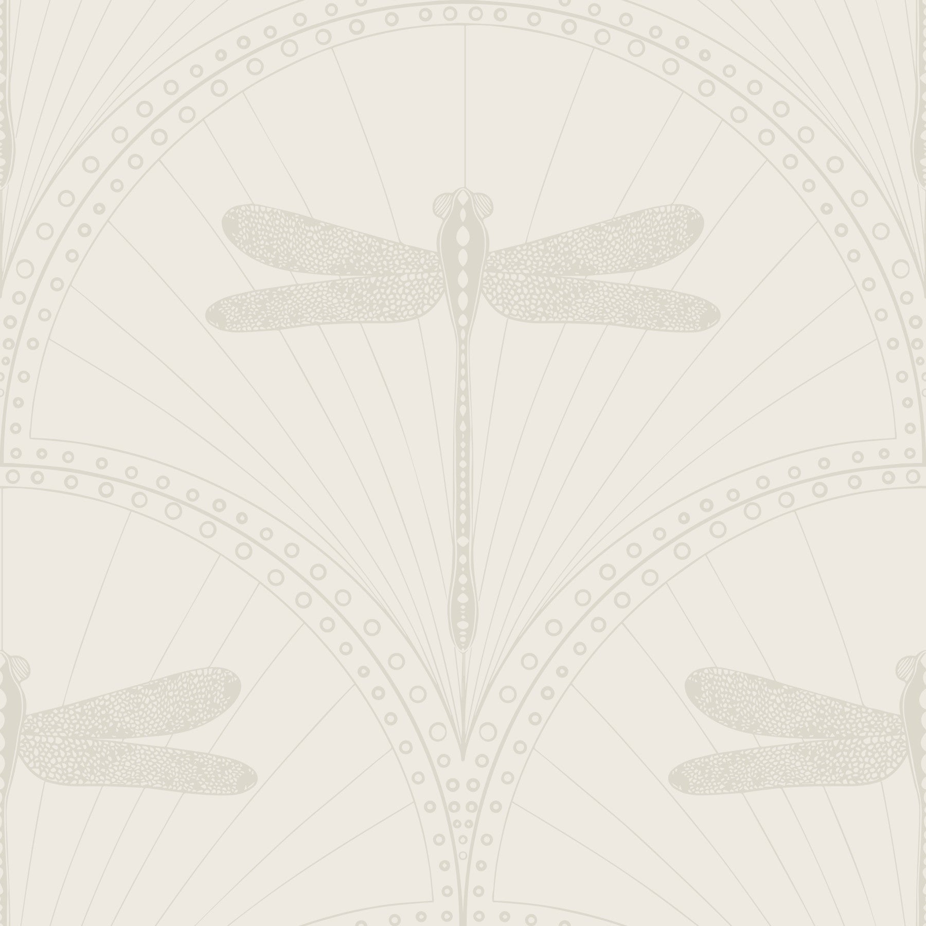 Elevate your space with the Art Deco Dragonfly wallpaper for walls. The repeated pattern, in a soft beige, showcases dragonflies in a stylized Art Deco design. The circles and radiating lines create a bold yet sophisticated geometric repeat. Consider this design for living rooms, dining rooms, or bedrooms, where it will add a touch of understated elegance. It's soothing neutral tones will enrich interiors with a light and airy feel, offering a timeless appeal.