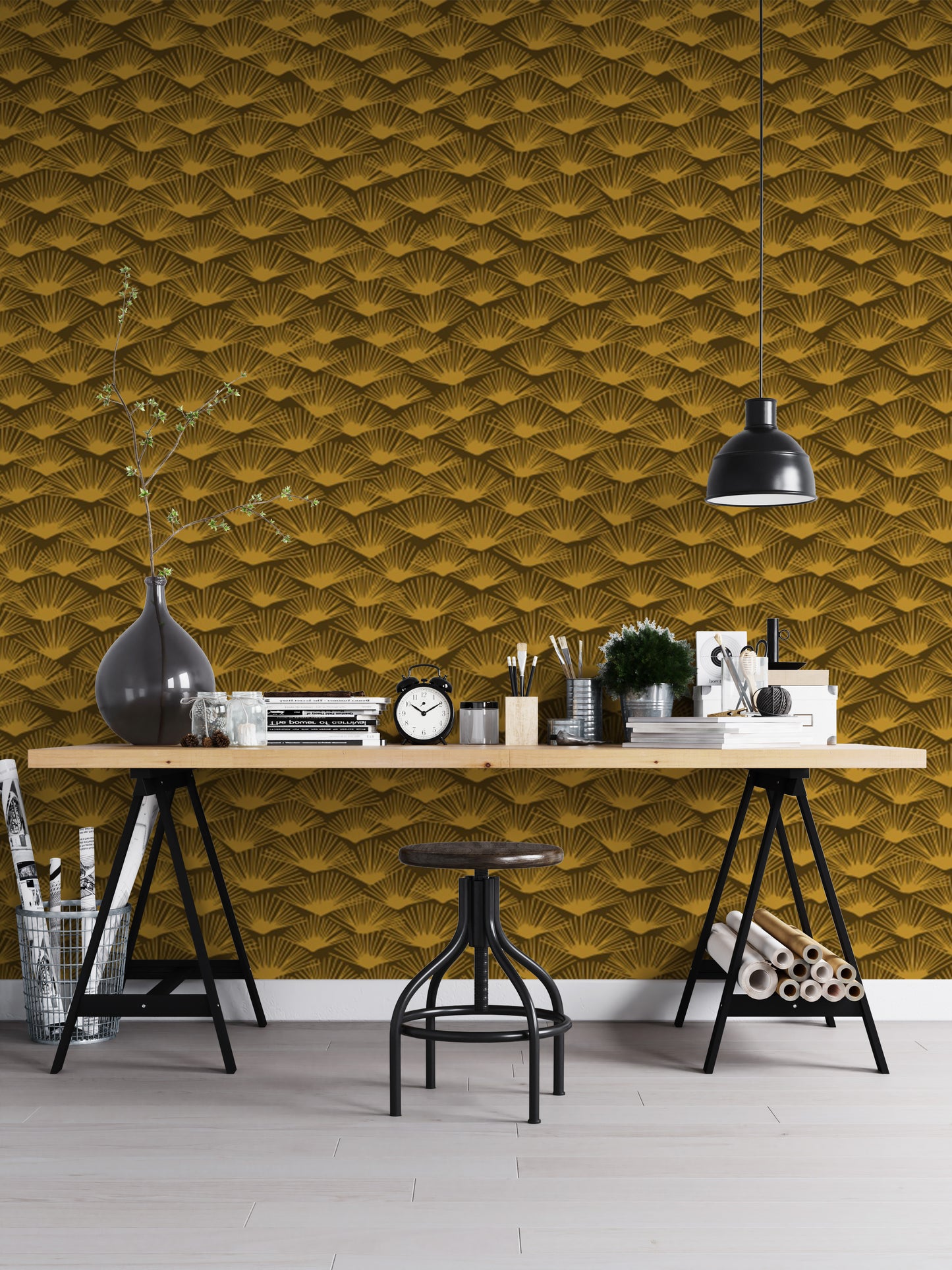 Golden Art Deco Fanfare wallpaper with sleek fan motifs.