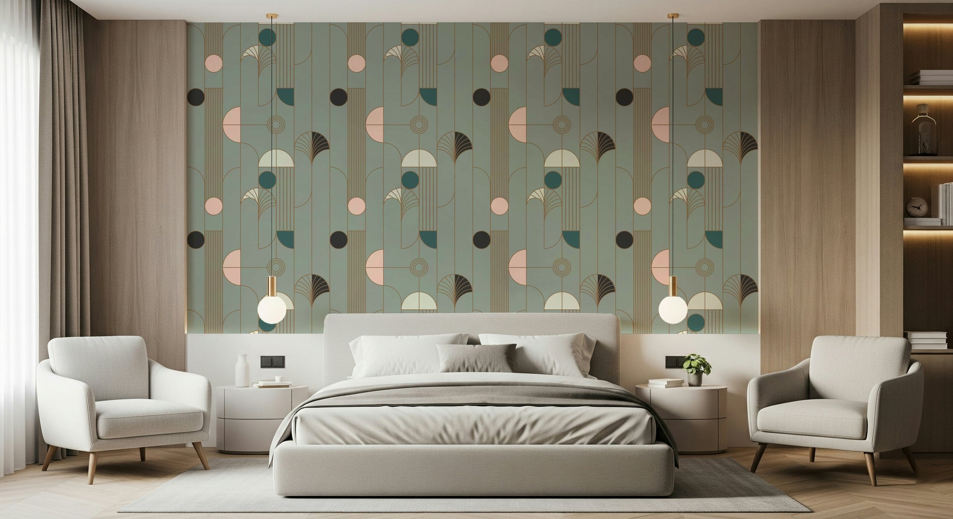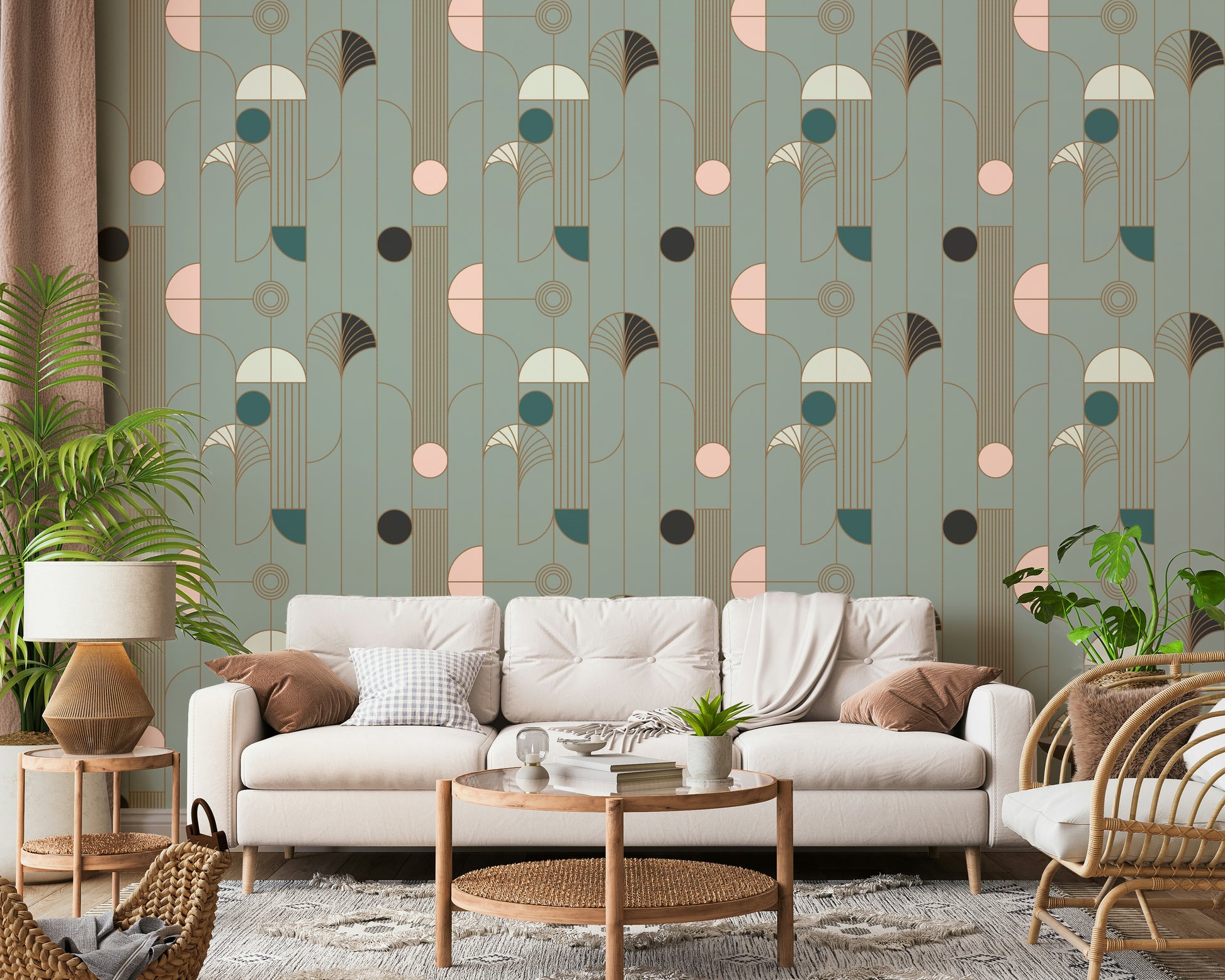 Immerse yourself in the elegance of a bygone era with "Art Deco Geometric Harmony," a sophisticated wall décor piece that evokes the glamour and streamlined aesthetics of the Art Deco movement. This design features a mesmerising composition of geometric shapes, including circles, semi-circles, and linear elements, meticulously arranged to create a sense of balance and visual intrigue. A soft, muted colour palette of serene greyish-green, blush pink, deep teal, and subtle gold accents provides a refined and calming backdrop, enhancing the overall sense of understated luxury. The clean lines and stylised forms contribute to a distinctly modern yet timeless feel, making it an ideal choice for adding a touch of vintage charm and architectural interest to any interior space. Transform your walls into a gallery of geometric artistry with this captivating and harmonious design.
