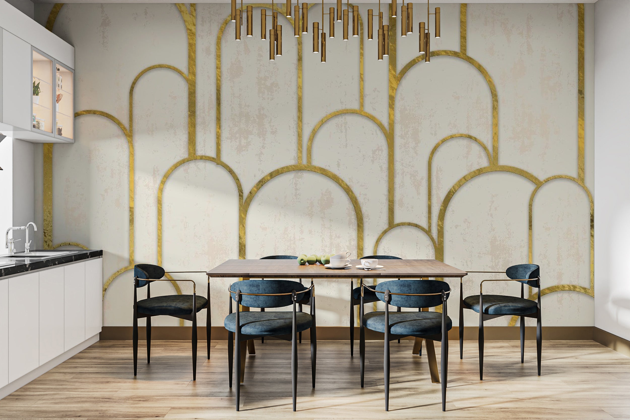 Elevate your space with the gold and white art deco wallpaper, the latest design that seamlessly blends classic elegance and modern aesthetics. This wallpaper features a striking pattern of gold archways on a serene off-white backdrop, creating a visually stunning three-dimensional effect. The arches, a symbol of architectural beauty, infuse your room with grandeur and timeless sophistication. Perfect for those aiming to add a touch of luxury to their interiors, this wallpaper serves as more than just a backdrop; it's a statement piece.
