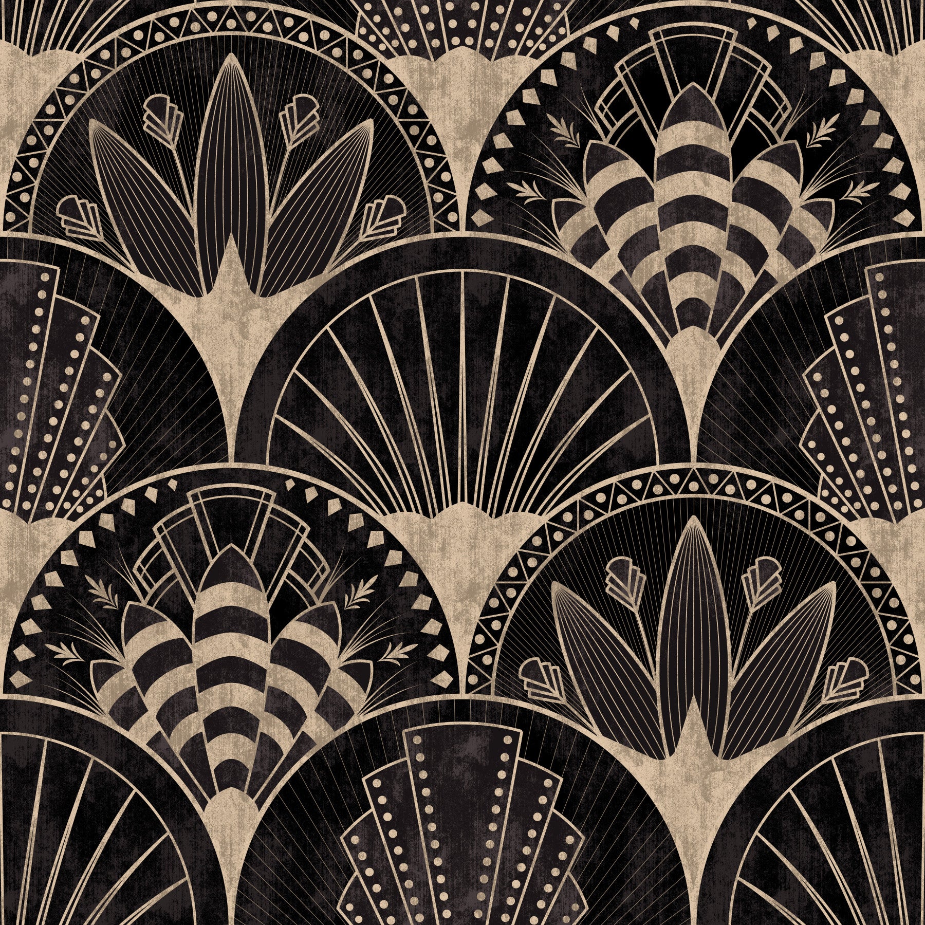 This wallpaper captures the sophisticated charm of the Art Deco era. The design features a seamless pattern of geometric shapes and stylized floral motifs in a rich palette of black and beige. The textured background adds a sense of depth and vintage appeal, while the precise lines and elegant curves create a feeling of refined luxury. Perfect for adding a touch of classic glamour to any space, this wallpaper is a statement piece that elevates the ambiance of a room. Its timeless design ensures it will remain stylish for years to come, creating a visually stunning focal point in your home or office.