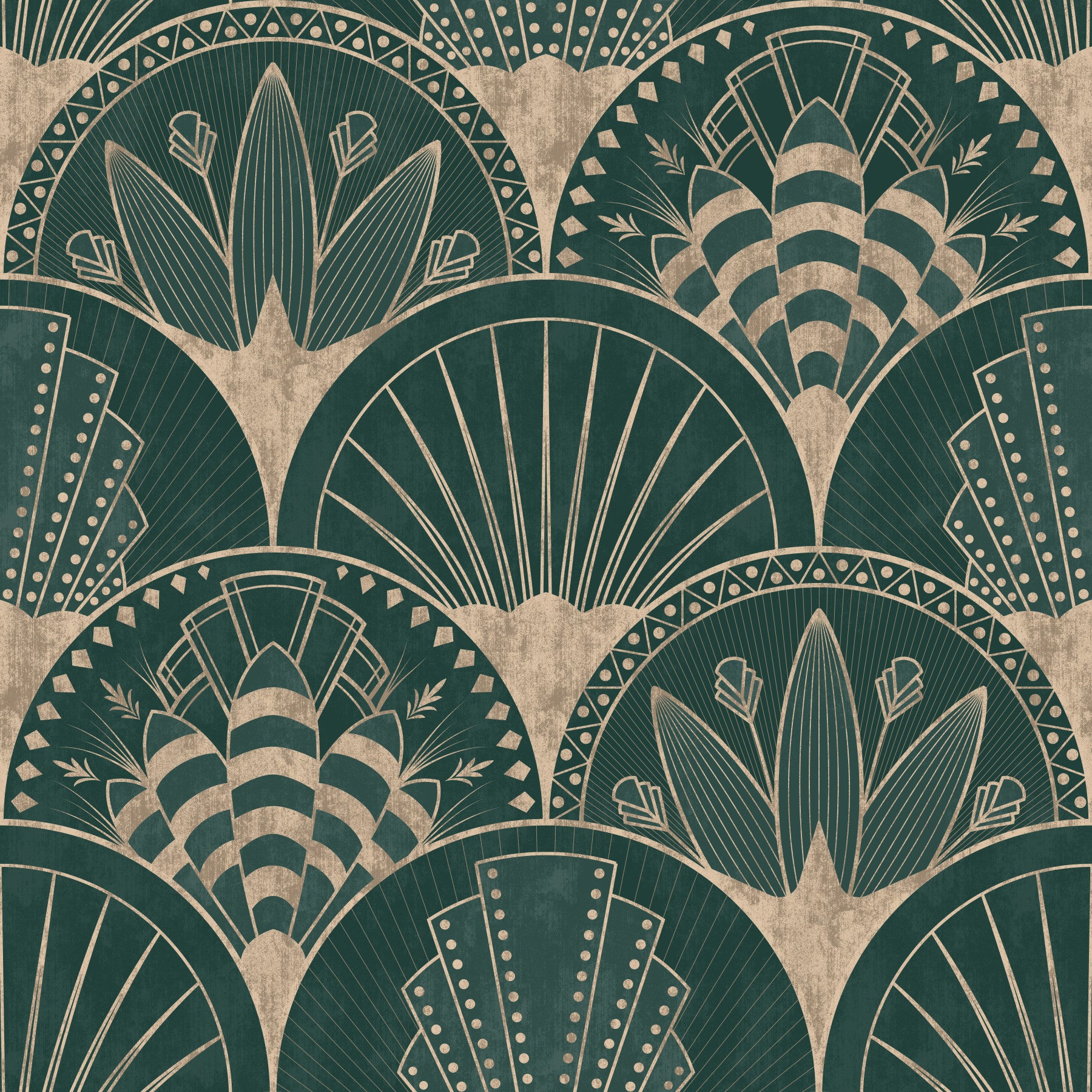 This stunning wallpaper showcases a captivating Art Deco design in rich emerald green and beige. The intricate geometric patterns and stylized floral motifs create a sophisticated and luxurious feel, reminiscent of the glamorous 1920s. The textured background adds depth and visual interest, enhancing the overall elegance of the design. Perfect for adding a touch of vintage glamour to any room, this wallpaper effortlessly blends classic style with modern sensibilities. Its rich color palette and intricate details make it a statement piece that will elevate any space.
