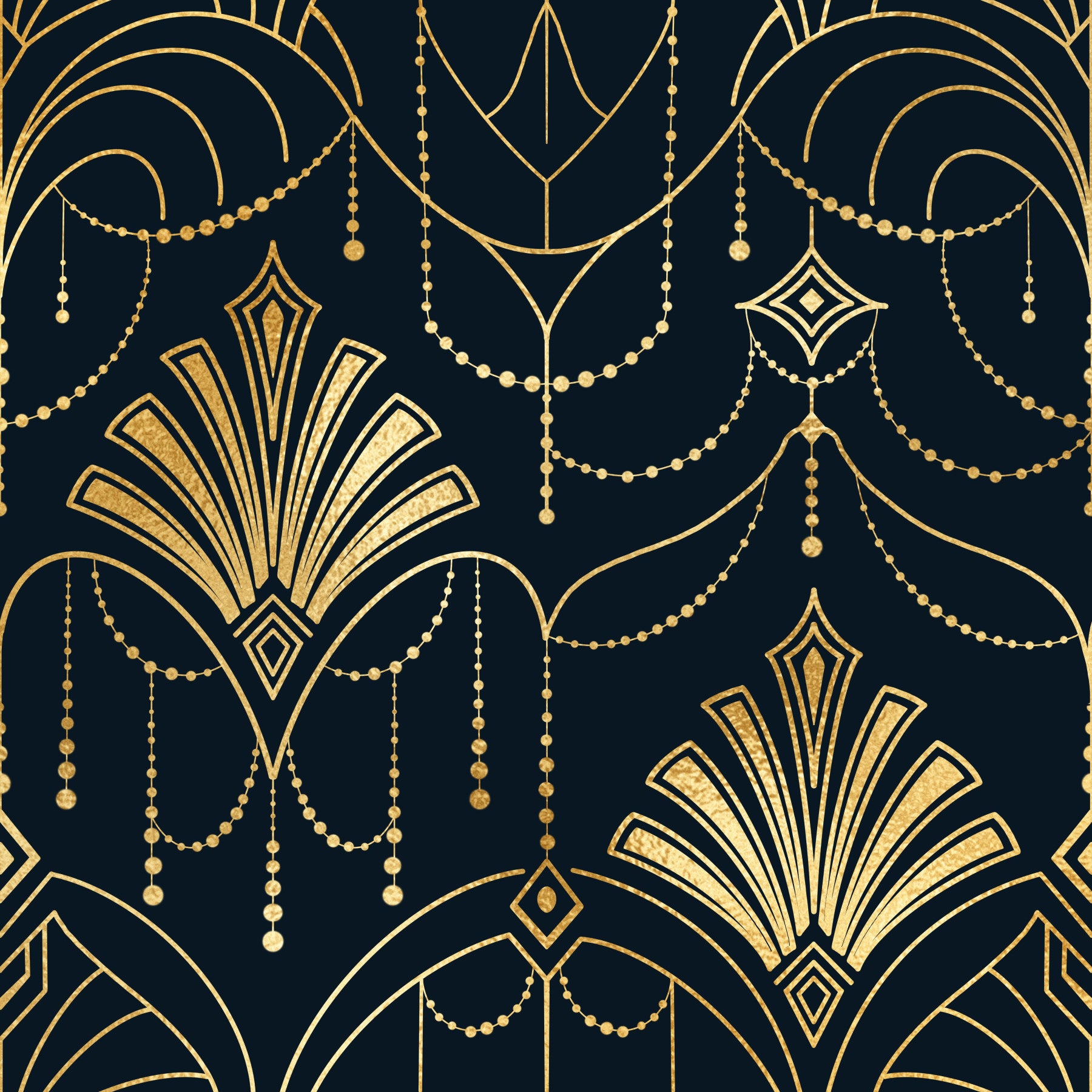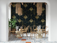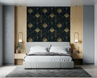 Elevate your interior with this lavish Art Deco-inspired pattern. Notice the intricate lines and bead details in shimmering gold tones against the dark background. The design brings a sense of understated elegance. Consider this wallpaper for walls to enrich any setting. The design looks sensational in a dining room or hallway, creating a striking visual statement. It enhances both minimalist and richly decorated spaces.