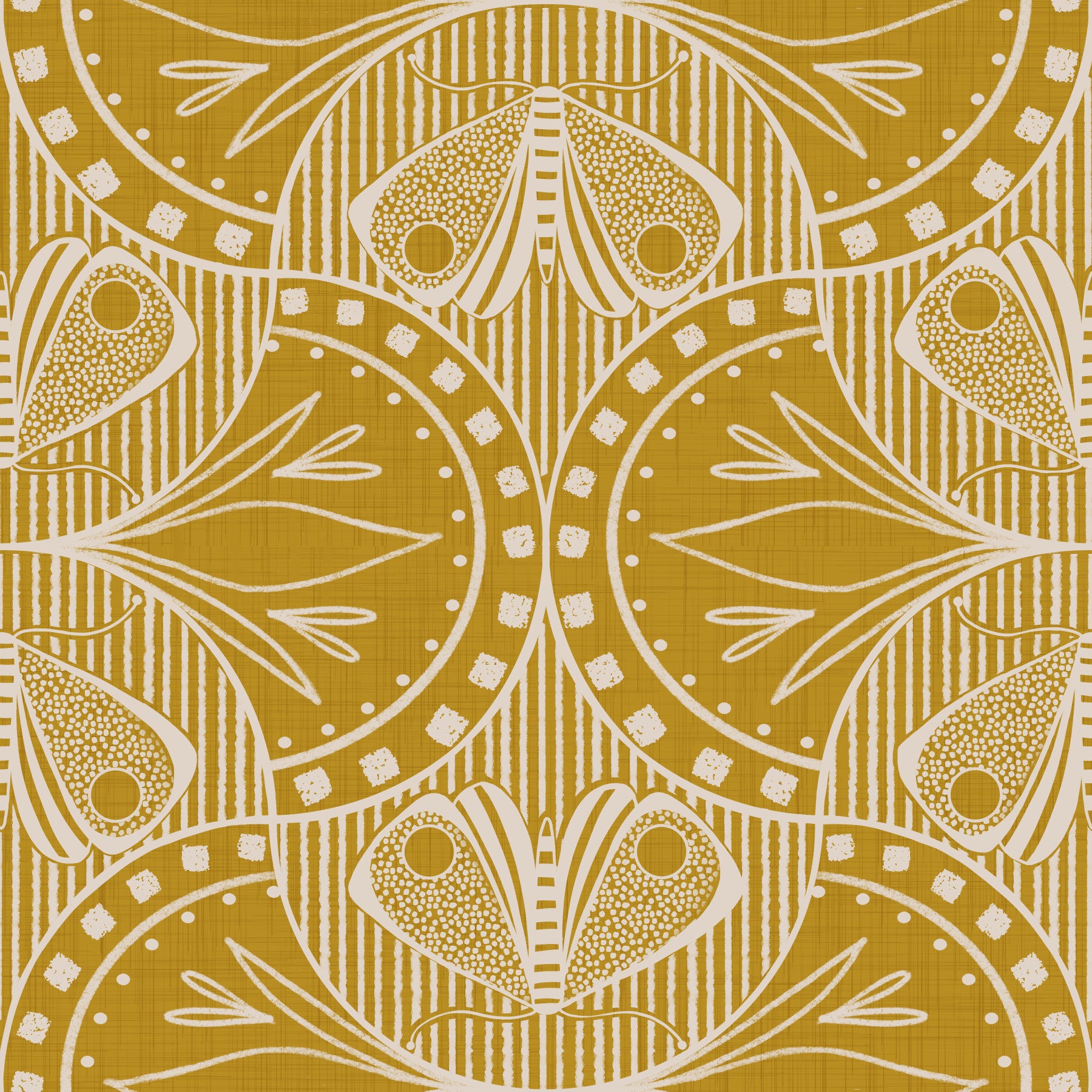 Ochre yellow wall mural, cream white Art Deco style moth pictures, intricate.