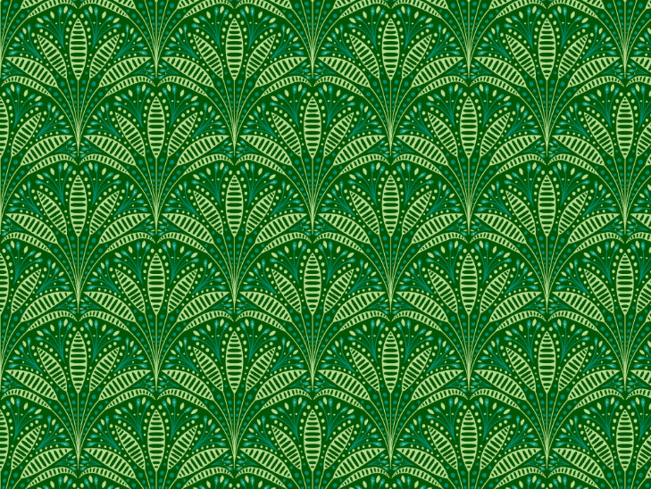 Bold Art Deco wallpaper featuring intricate green palm patterns.