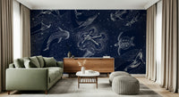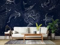 Journey to a celestial sea with this unique wallpaper. An astronaut adrift in a star-filled sky meets marine life. Sharks, whales, rays, a turtle, and jellyfish are woven amongst a blanket of stars in this mesmerising image. This unique wallpaper for walls makes a statement in any space. It can enhance a living room by adding an imaginative touch or give a bedroom a calming, otherworldly ambiance. The navy and white design creates a sophisticated look that works great with minimalist or nautical decor.