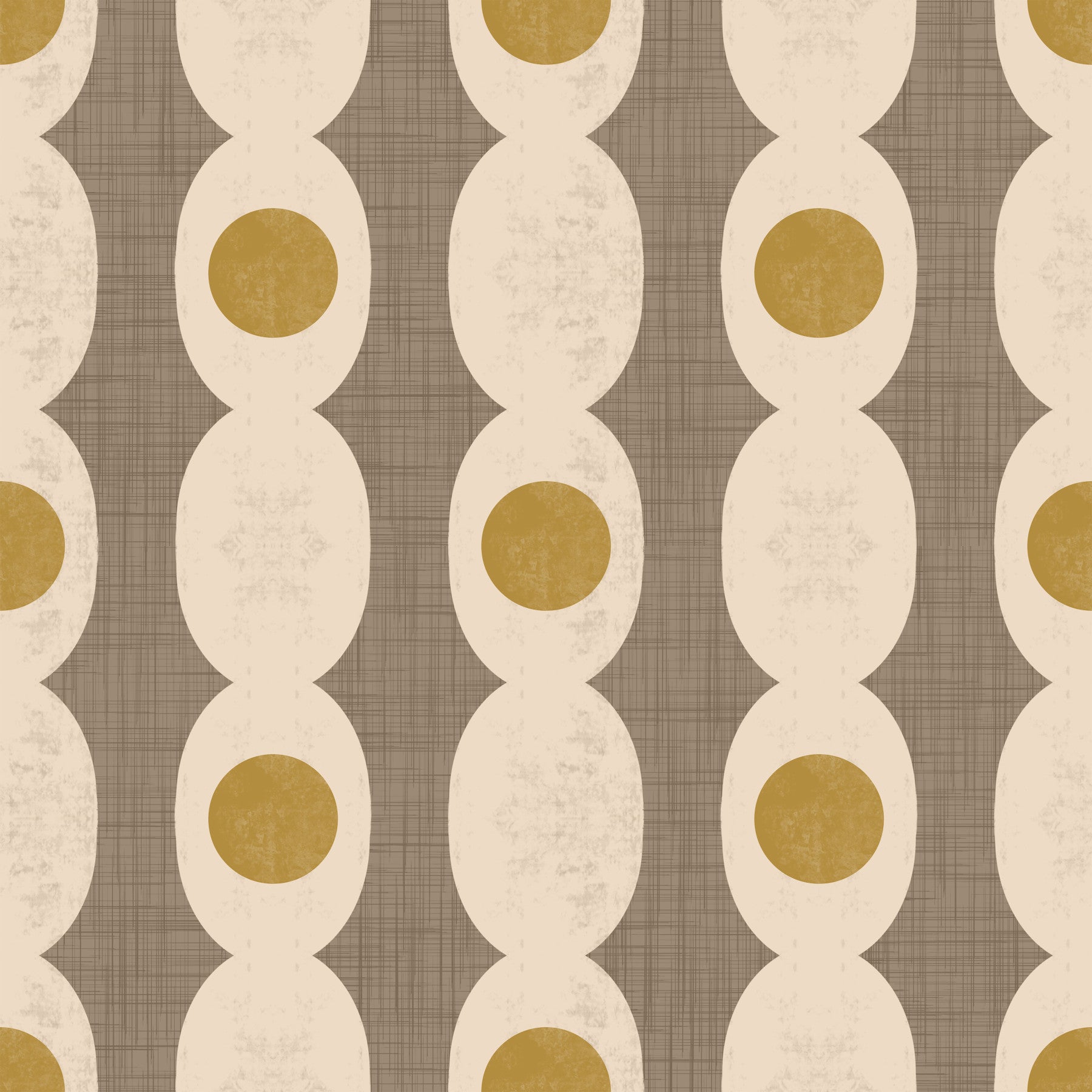 Infuse your home with a dose of vintage style through this wallpaper for walls. It displays stacked, off-white ovals punctuated by mustard yellow circles. A crosshatch pattern in taupe sets the design nicely. The vintage feel is balanced by a neutral colour scheme. Consider this in a bedroom, living room, dining area, or home office. The design gives a stylish vintage look while still complementing other furniture and décor elements.