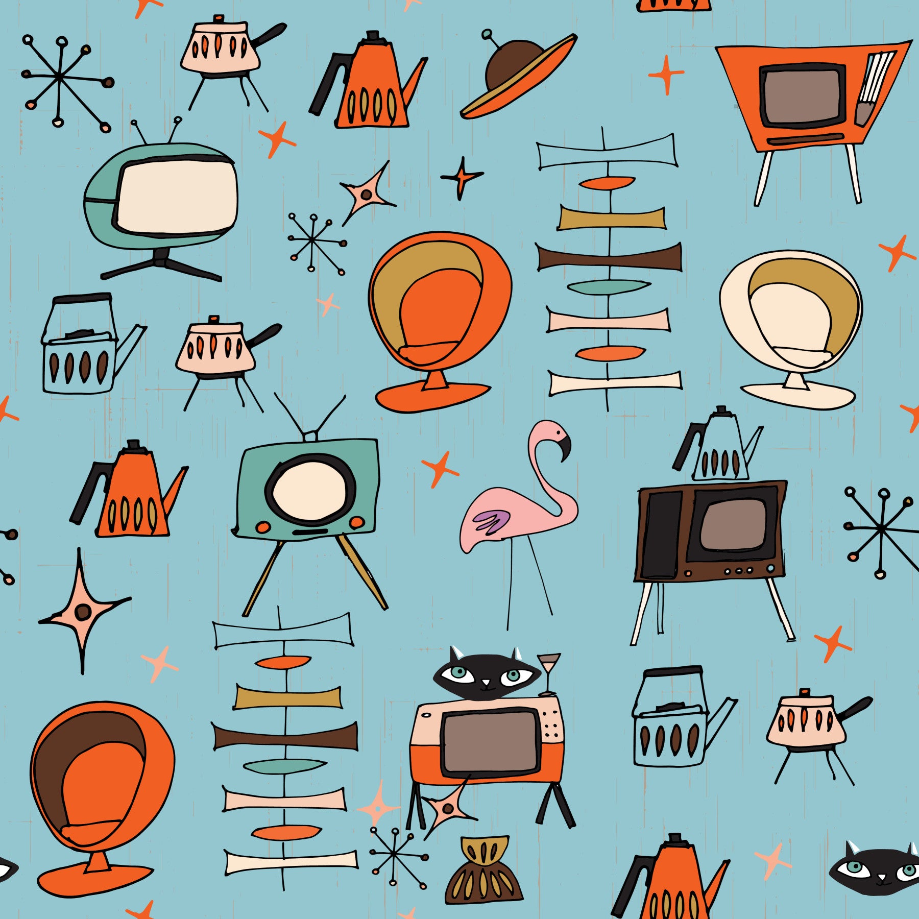 Googie Elements Atomic Retro Wallpaper, Teapots, Pod Chairs.