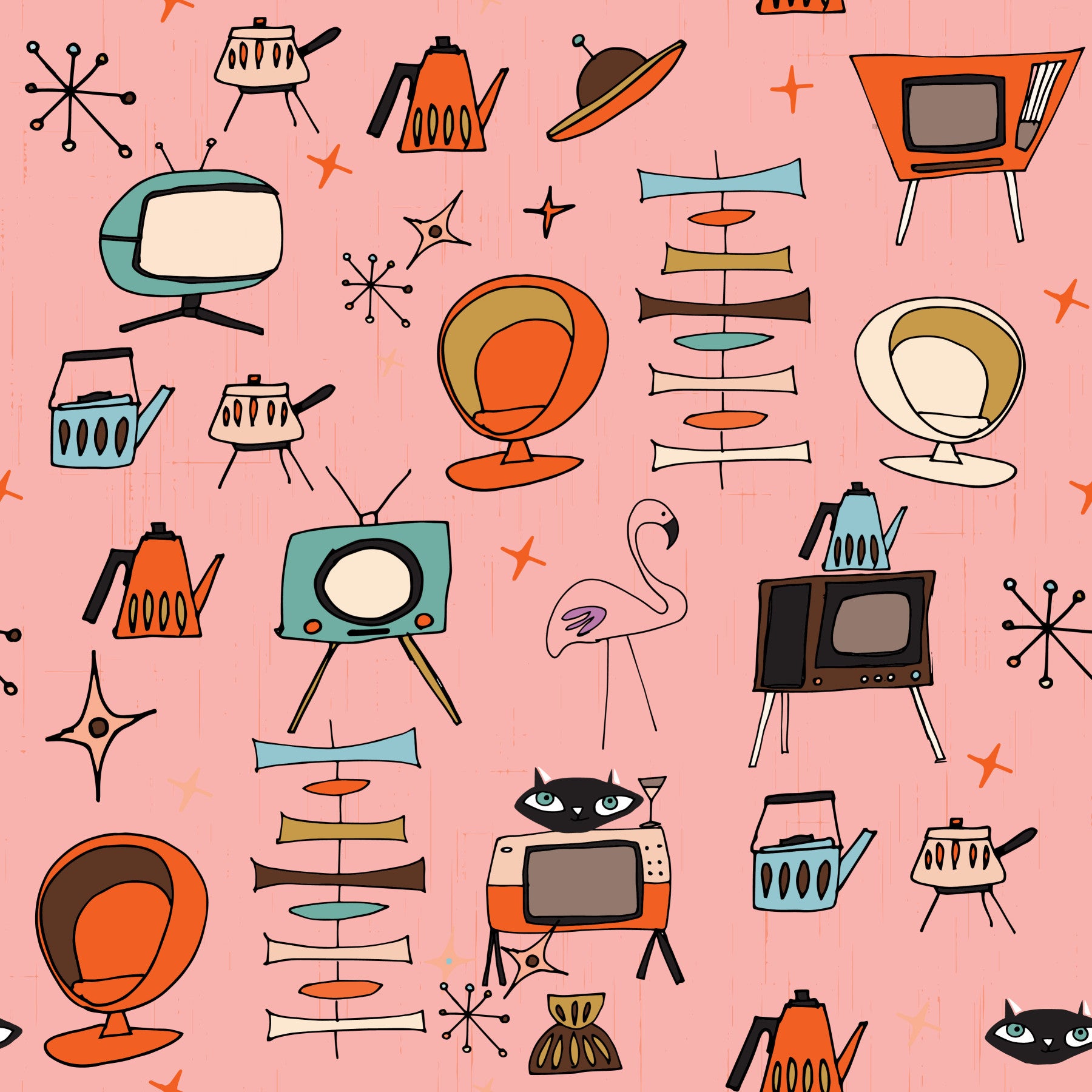 Stylized 1960s Atomic Wallpaper, Groovy Retro Furnishings.