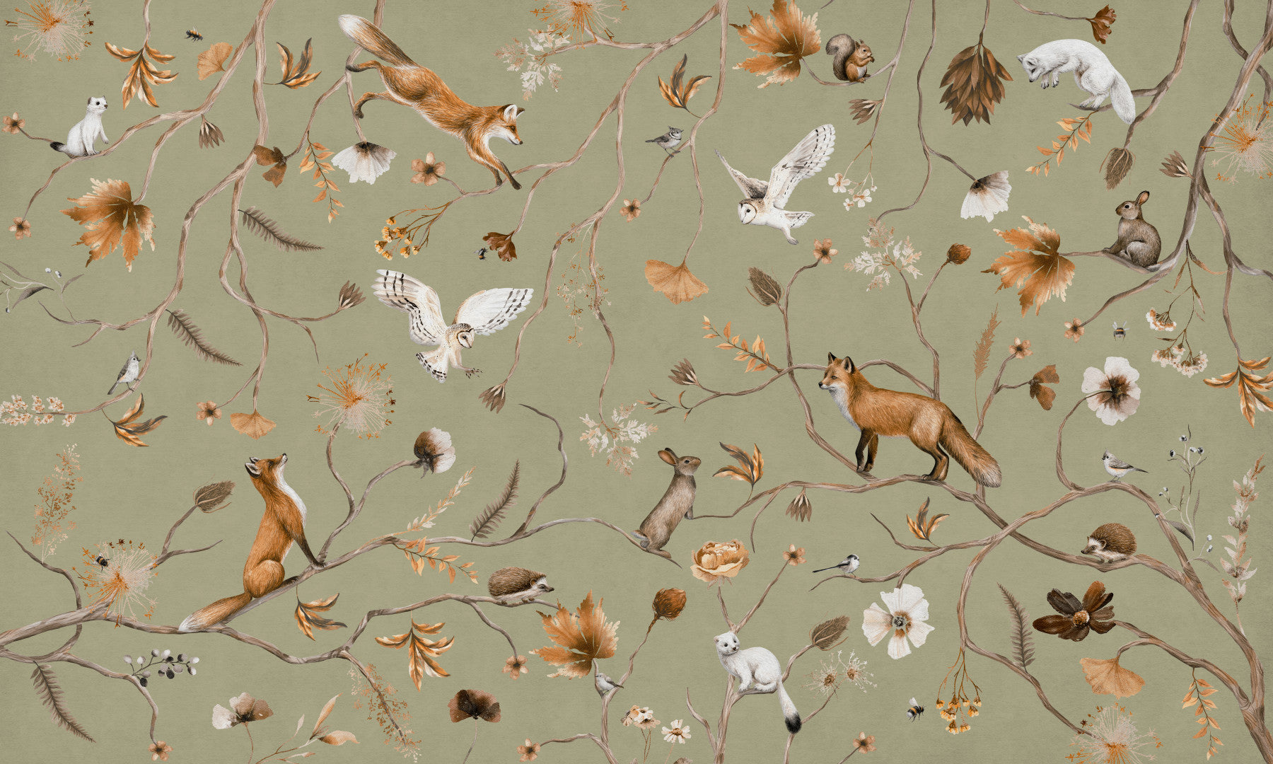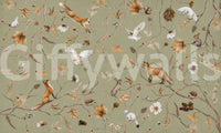 Transform your home with this elegant depiction of autumn's beauty. The design showcases a range of woodland creatures perched on delicate branches with falling leaves. Its soft palette of beige, brown, and ivory ensures it will enrich various interior design choices. This captivating wallpaper for walls is ideal for creating a peaceful atmosphere in a bedroom, living room, or dining room. This design complements classic, rustic, and farmhouse interiors, enhancing the natural light and making the room feel more open and inviting.