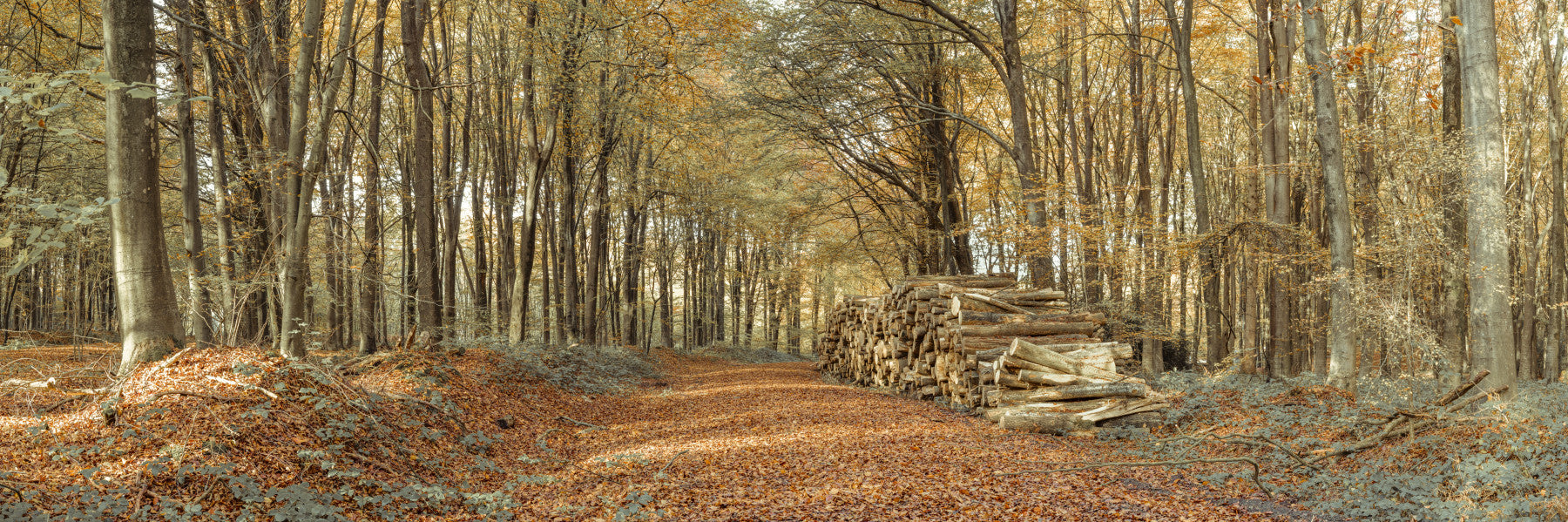 Vast wooded landscape, chopped timber pile, Autumn Forest Scene print.