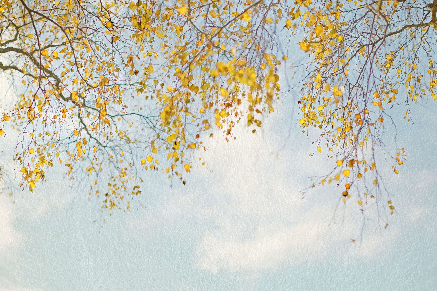 Celebrate the beauty of the season with the cheerful Autumn Hues Woodland wall mural. This bright and airy design captures the golden foliage of birch trees hanging gently across a soft, pale blue sky, accented by a subtle, painterly texture. The upward perspective creates a feeling of openness and light, instantly expanding your room. This high-quality mural wallpaper uses a warm yellow and cool blue palette, offering a balanced and inviting aesthetic. Choosing this unique wallpaper for walls is perfect for creating a refreshing and positive atmosphere in a nursery, dining area, or living space.