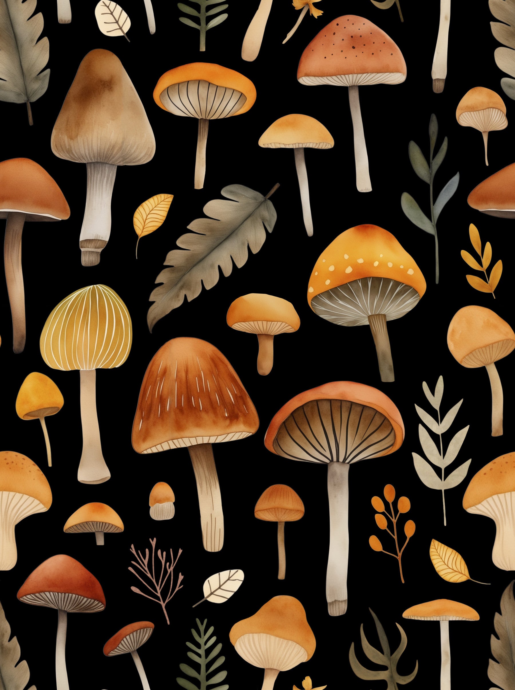 A wallpaper with a whimsical watercolor pattern of mushrooms and foliage.