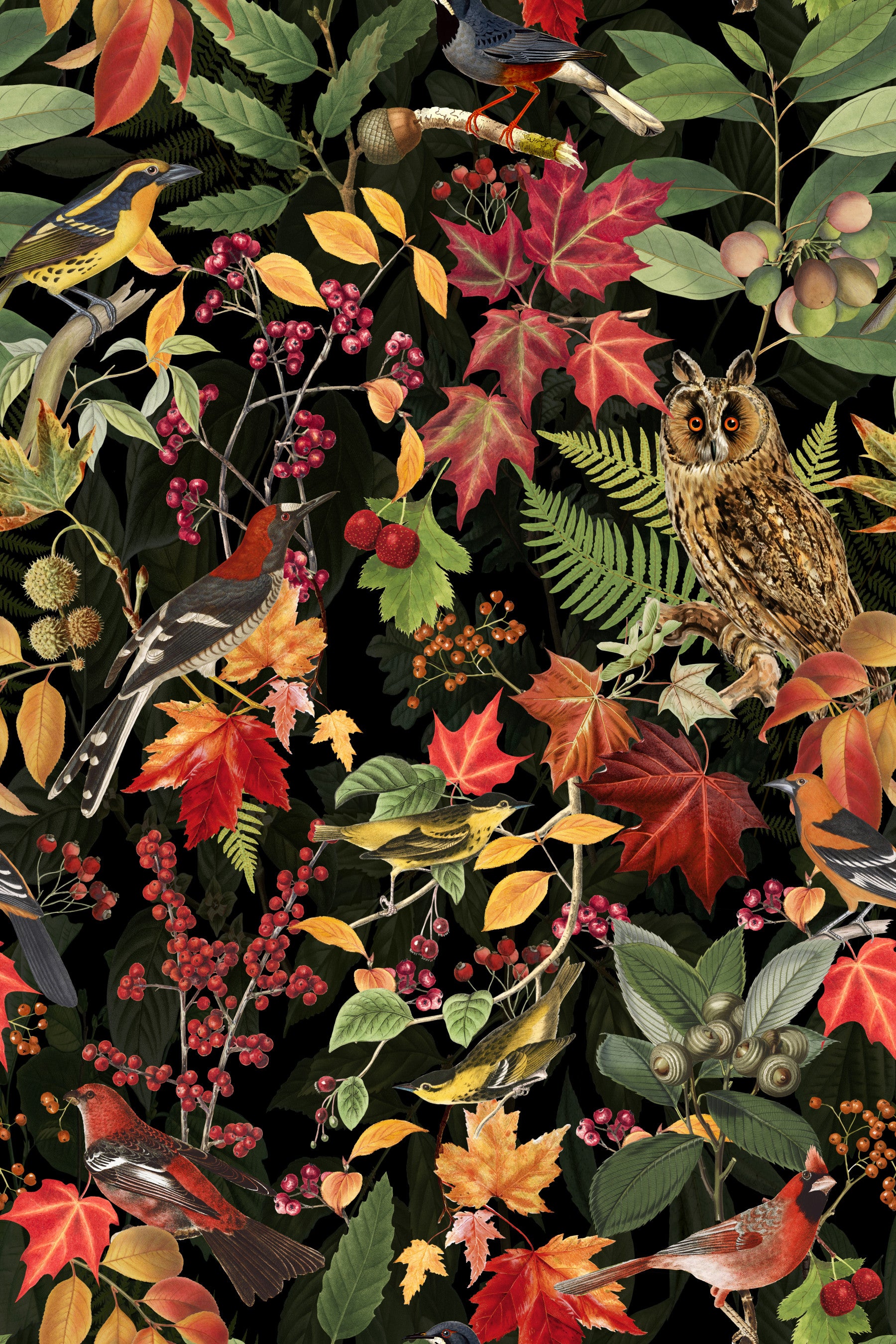 Transport yourself to a whimsical world where nature's beauty and vintage charm intertwine seamlessly. This fall wallpaper was inspired by the enchanting allure of vintage botanical art. Delicate birds gracefully perch on intricate branches adorned with vibrant autumn leaves and clusters of berries, creating a captivating tapestry of seasonal splendor. The intricate details and warm, earthy tones evoke a sense of nostalgia, as if stepping into a cherished memory from yesteryears. This pattern seamlessly blends the elegance of avian companions with the richness of autumn hues, infusing any space with a cozy, timeless ambiance. Embrace the harmony of nature and vintage aesthetics with this design and let your surroundings come alive with the grace and beauty of the fall season.