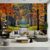 Transform your rooms with the serene beauty of this forest path wallpaper for walls. The design features an inviting pathway lined with trees in full autumn colour. Fiery reds, oranges, and yellows combine to create a display of seasonal warmth. Ideal for hallways, living rooms, or bedrooms, this wallpaper brings the tranquility of nature indoors. It enhances spaces with a sense of depth and light, making rooms feel both expansive and inviting. Create a sophisticated and calming atmosphere with this stunning wall décor.