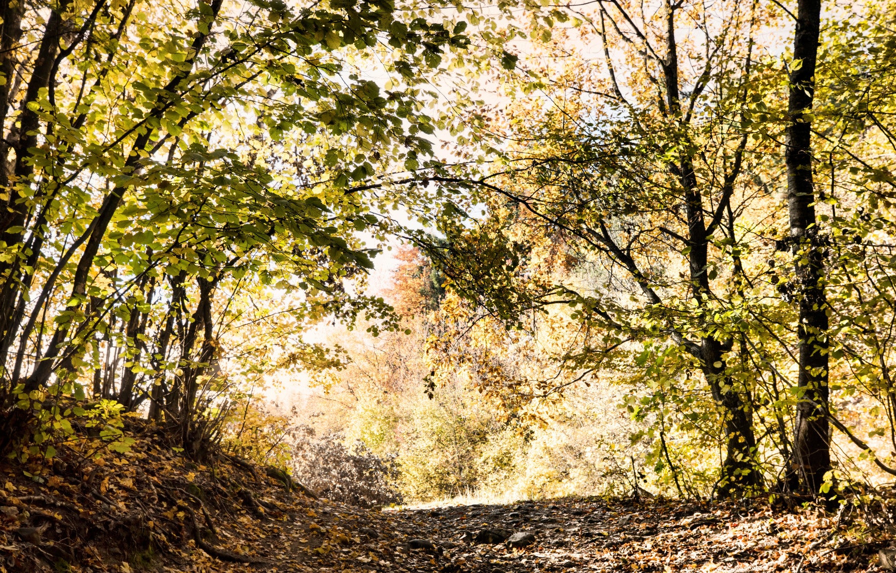 A photo-realistic wall mural of an autumn pathway in a forest.