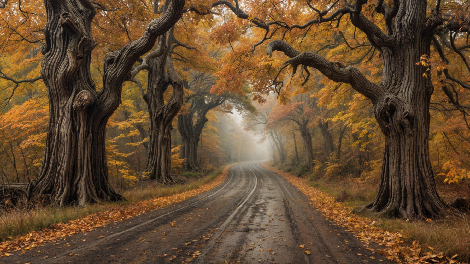 Transform your space with this captivating wallpaper for walls, showcasing a serene autumn road framed by majestic, gnarled trees. Golden leaves create a warm canopy, infusing any room with rustic charm. The muted earth tones provide a calming backdrop, ideal for living rooms, bedrooms, or hallways. This design adds depth and texture, evoking a sense of tranquility. Let this scenic view bring the beauty of the season indoors, enhancing your home with a touch of natural elegance and peaceful ambiance. Its detailed imagery complements both modern and classic interior styles.