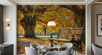 Immerse your space in the golden embrace of autumn. This wallpaper for walls showcases a tranquil park scene, complete with vibrant foliage and a welcoming bench. The rich hues of orange, yellow, and brown infuse your room with warmth and comfort. This design creates a soothing atmosphere, ideal for a living room, bedroom, or hallway. Imagine this pastoral landscape enhancing a cosy reading nook or brightening a home office. The detailed textures of leaves and tree bark bring nature indoors, making any space feel like a serene escape.
