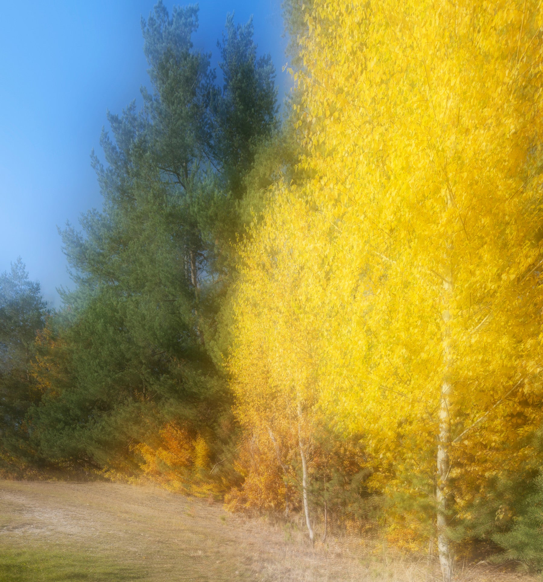 This striking piece presents a unique interpretation of autumn's beauty, showcasing vibrant yellow foliage against a backdrop of deep green pines. The soft focus and gentle movement in the composition convey a sense of tranquility, inviting viewers to reflect on the fleeting moments of nature.