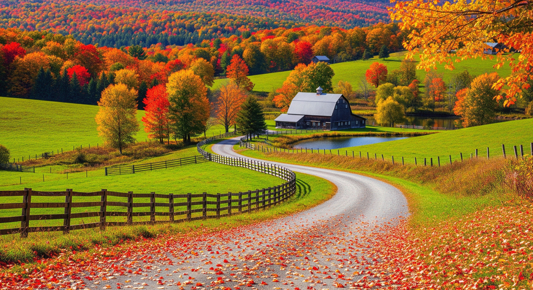 Experience the splendor of fall with this vibrant wallpaper for walls. Rolling green hills meet a forest ablaze with red, orange, and yellow hues. A winding path leads to a charming barn, complete with a tranquil pond. This peaceful countryside vista adds warmth to any room. Install it in your living room, bedroom, or entryway to welcome a sense of calm and rustic charm, enhancing the natural light and making spaces feel more inviting.