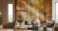 Transform your space with this striking forest image. It presents a scene where sunlight filters through trees, illuminating falling leaves. This wallpaper for walls shows nature's beauty and creates a peaceful atmosphere. The warm colours and soft light make it a great addition to a living room, bedroom, or home office. It enhances interiors with a sense of calm and connection to nature, creating a warm, inviting ambiance.