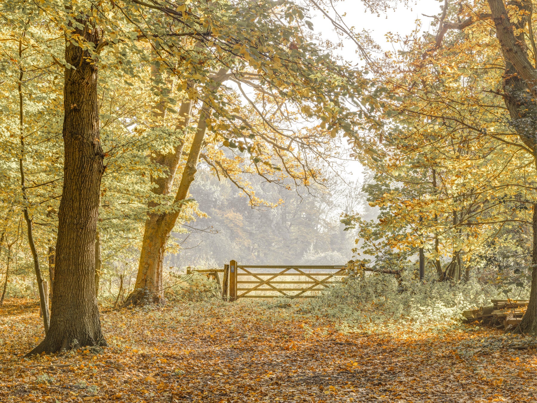 Wooden fence in forest. Invite the serenity of autumn into your home with this inviting wallpaper for walls. The scene depicts a tranquil woodland path, bathed in the warm glow of fall foliage. Golden and brown leaves create a natural pattern that enhances the visual depth of any room. This design brings a sense of calm to living rooms, bedrooms, or hallways, establishing a cosy atmosphere. The wooden gate provides a focal point that complements rustic or farmhouse-themed interiors, making it an excellent choice for creating a relaxed and nature-inspired space.