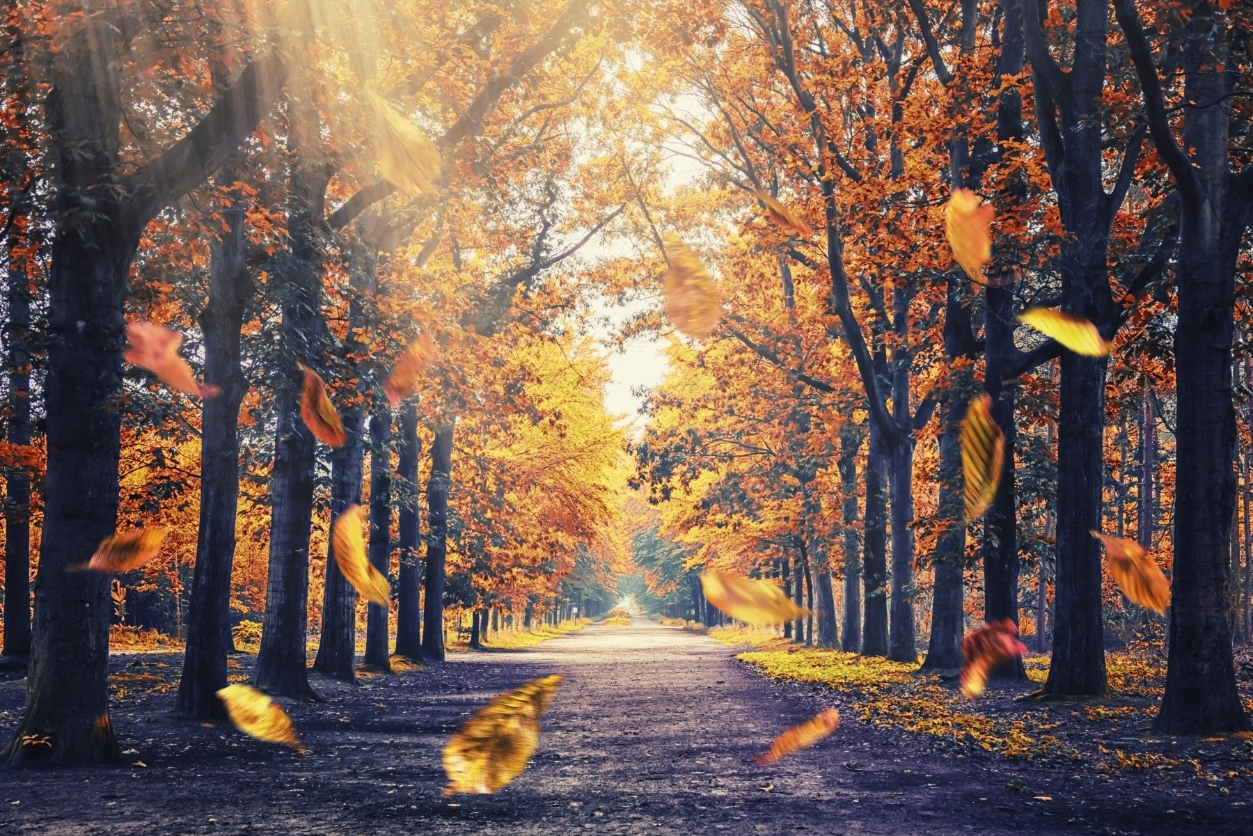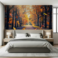 Transform your space with this stunning wallpaper for walls. Capture the serene beauty of an autumn forest with leaves swirling along a tree-lined path. The design features a rich colour palette of warm oranges, yellows, and deep blues, bringing a sense of peace and tranquility to any room. Ideal for living rooms, bedrooms, or hallways, this wallcovering creates an inviting atmosphere. The sun-drenched foliage and gentle shadows add depth and dimension, making it a focal point that enhances your home's aesthetic.