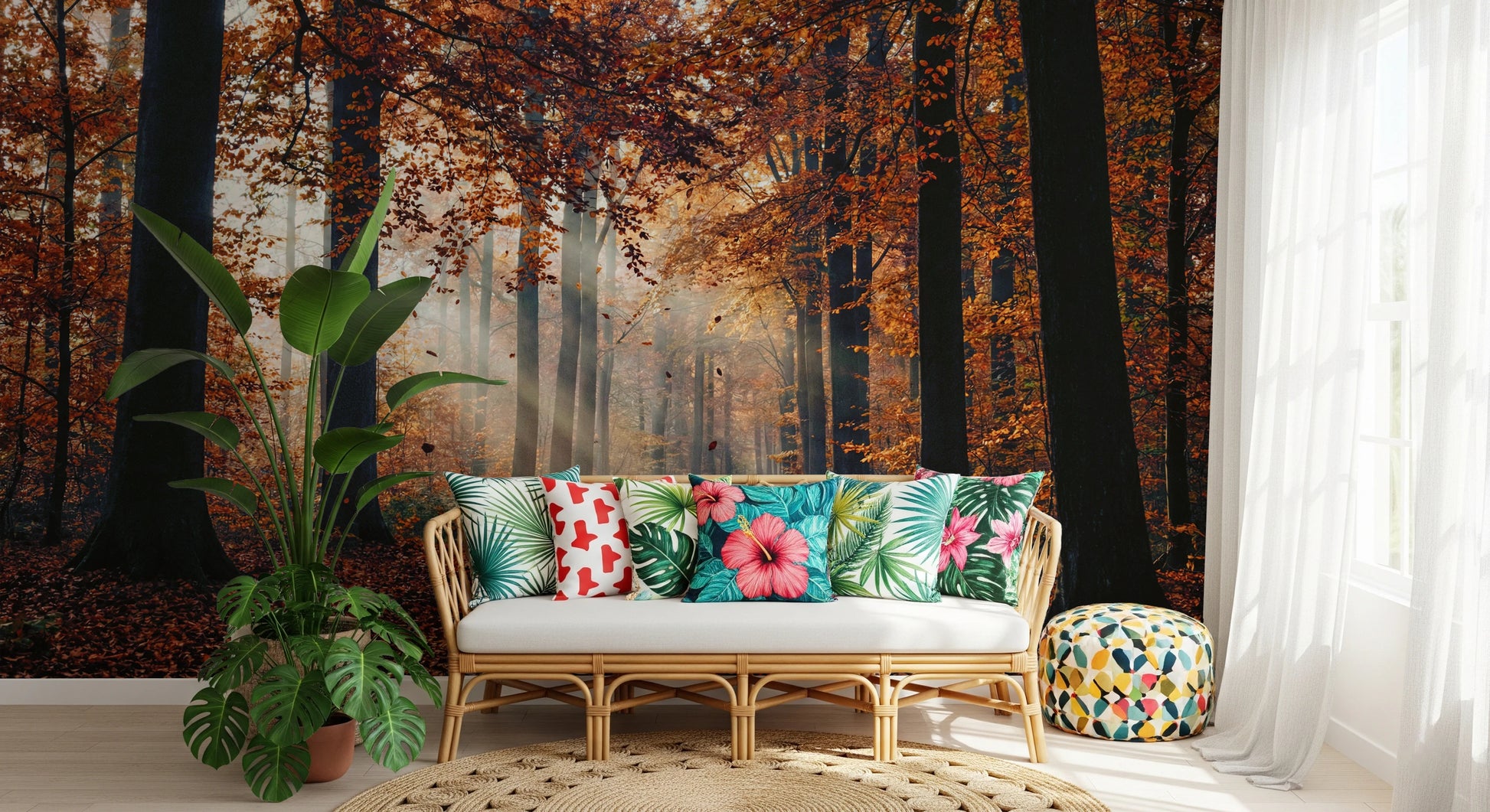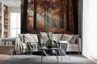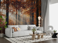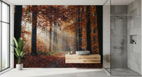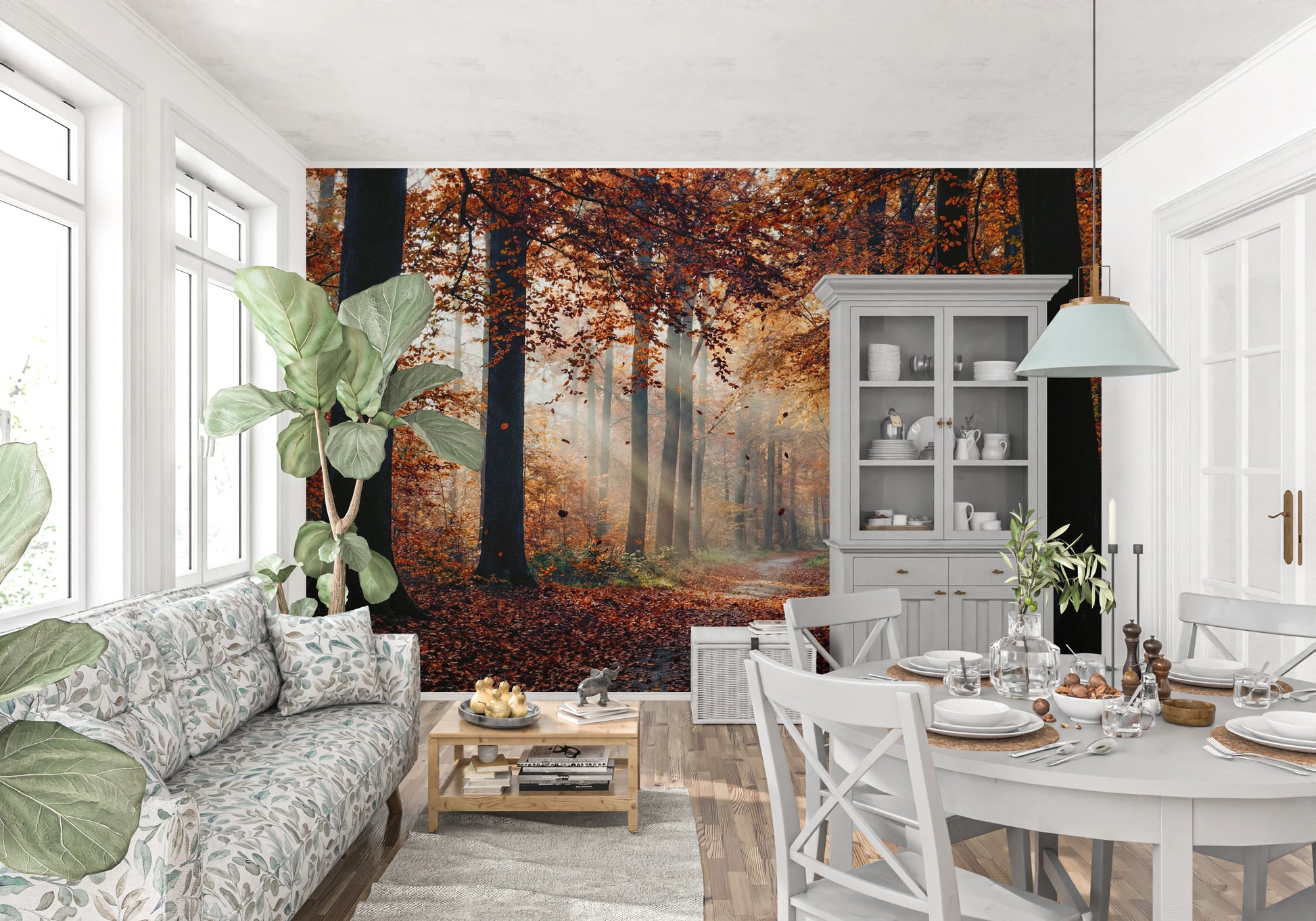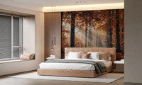 Transform any room with this stunning forest-themed wallpaper for walls. It showcases a sun-drenched autumn forest with rich shades of orange, brown, and tan. Sunlight filters through the dense trees, creating an inviting and peaceful scene. The design enhances the natural light in any room and adds warmth. This wallpaper works best in living rooms, bedrooms, or hallways. It creates a cosy atmosphere, making spaces feel more inviting. It complements rustic, traditional, and modern interior designs. The detailed imagery creates a calming effect, ideal for relaxation and contemplation. The natural aesthetic introduces a sense of the outdoors, promoting a serene environment. It brings the beauty of autumn indoors.