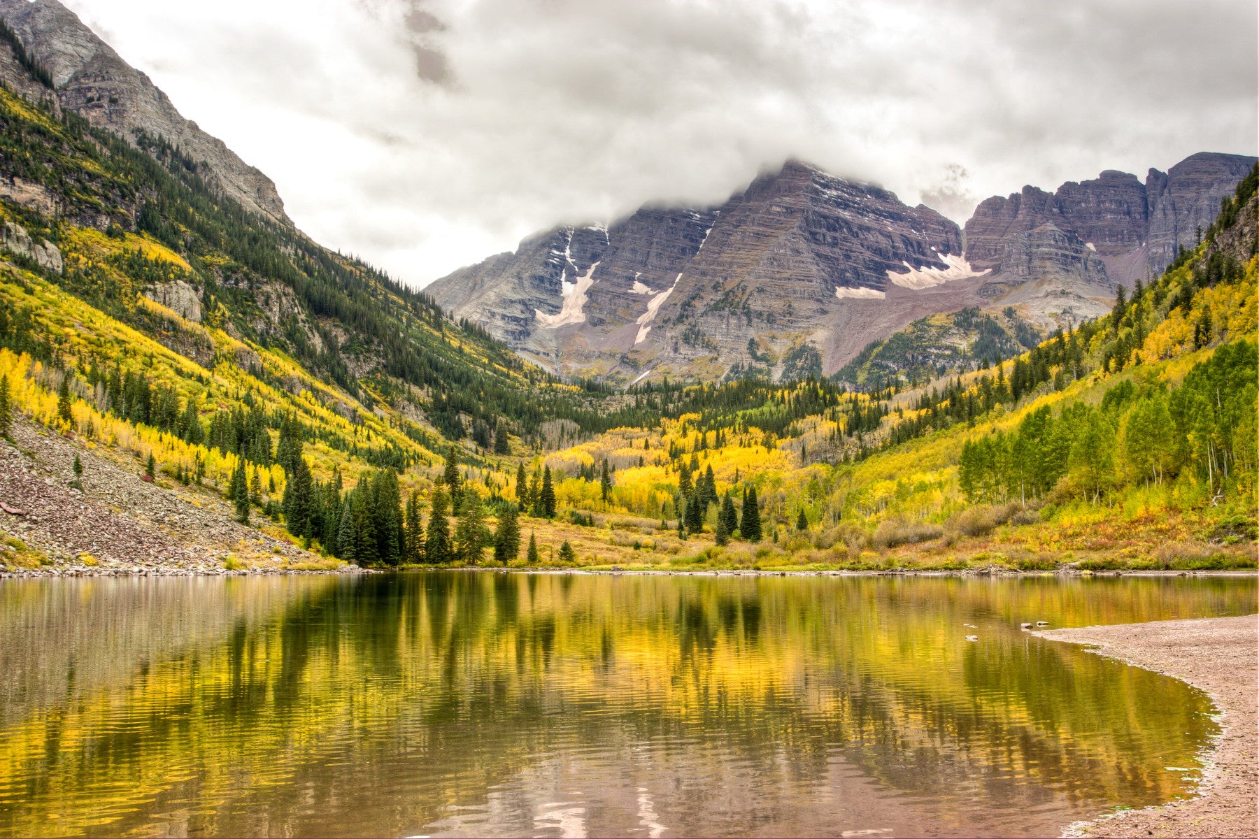 Immerse yourself in the beauty of nature with this amazing wallpaper. Capture the scenic vista of mountains and their mirror-like reflections on the still waters of a lake. The vibrant foliage adds charm to this scenery with its gradient shades of yellow and green. The cloudy sky adds depth and drama. This wallpaper for walls complements various interiors, from minimalist to rustic styles, especially in a living room, dining room, or even a hallway. Create a stunning feature wall.