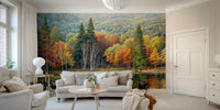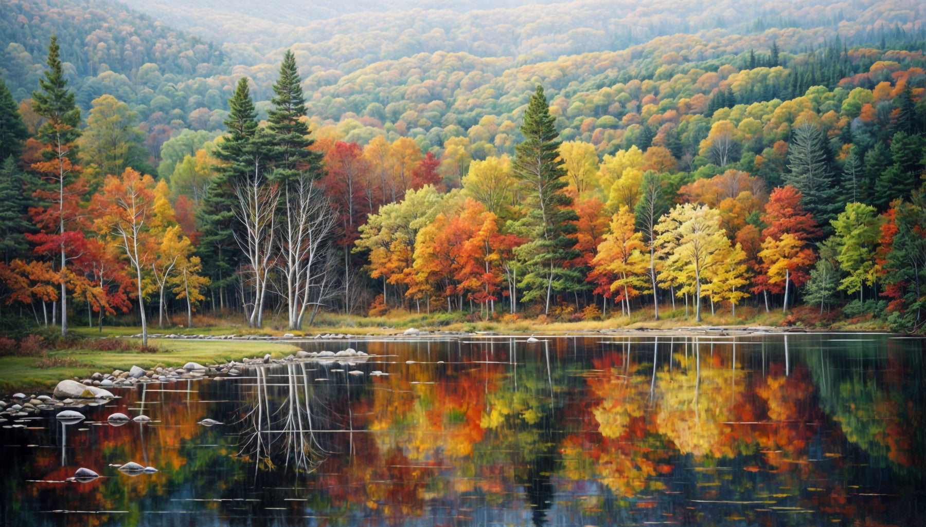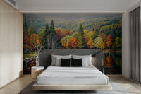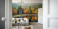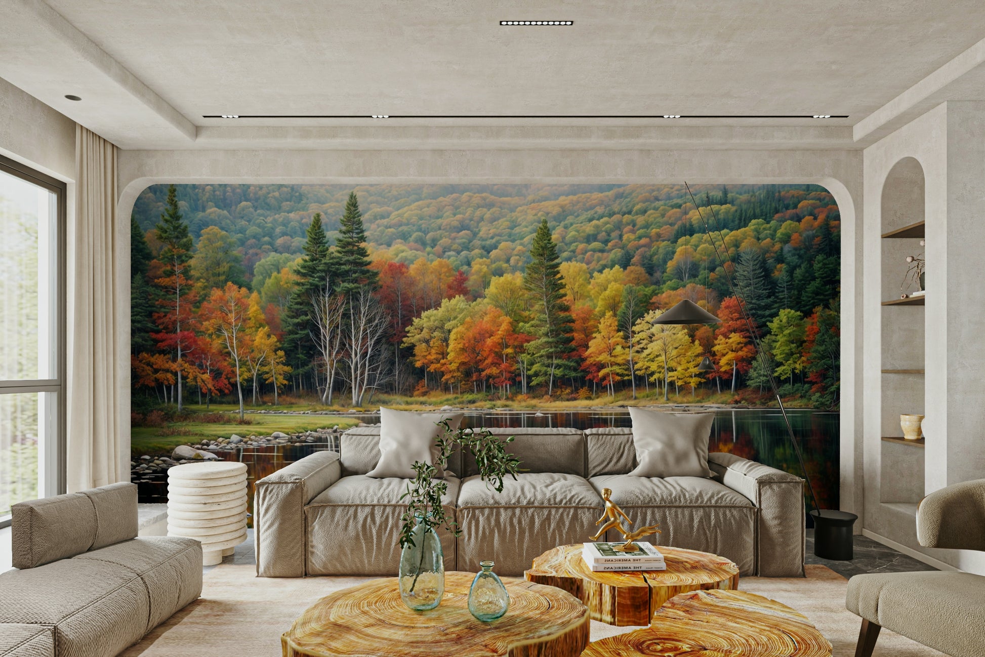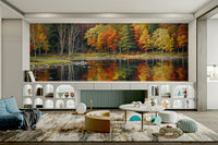Immerse yourself in the breathtaking beauty of autumn with this wallpaper. The image showcases a serene lake perfectly reflecting the vibrant hues of a forest ablaze with fall colours. Reds, oranges, yellows, and greens create a stunning tapestry of nature's artistry. The tranquil scene evokes a sense of peace and tranquility, making it the perfect addition to any space seeking a touch of natural serenity. The crisp details and realistic rendering create a captivating view, ideal for a calming and inspiring atmosphere.