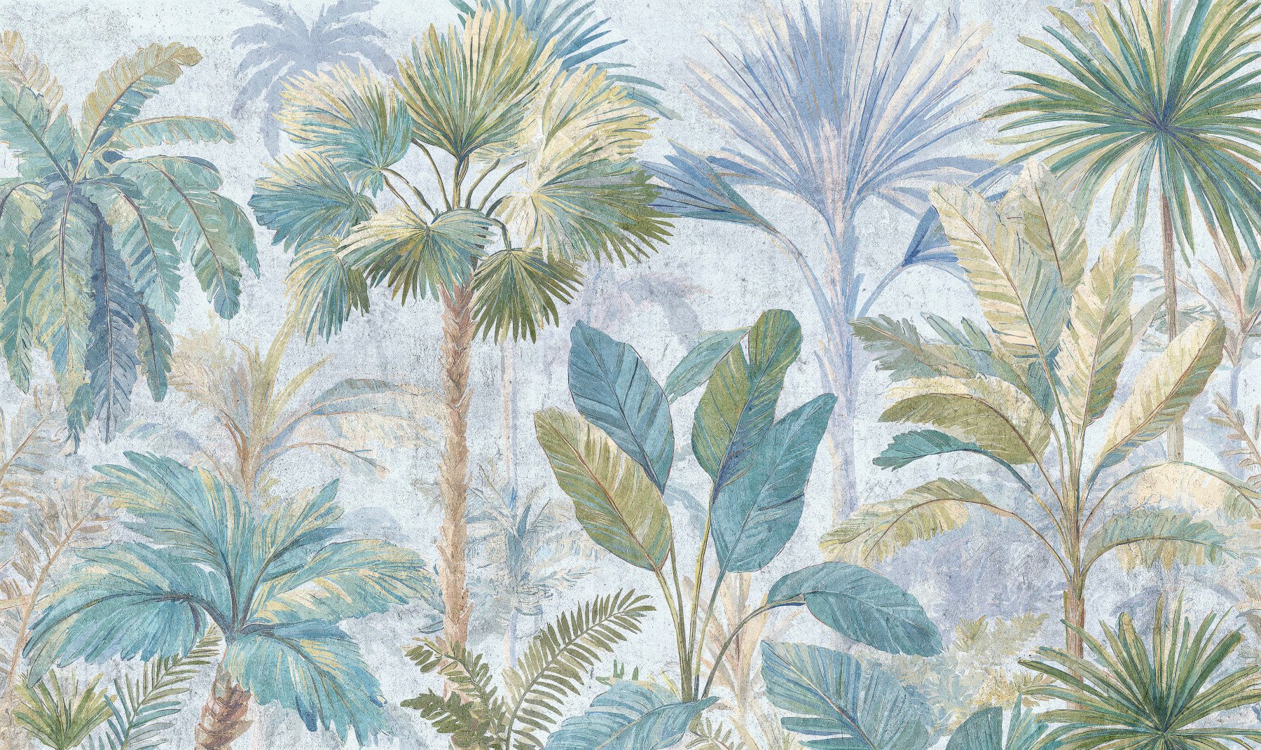Transform your room into a serene escape with this captivating design. Various palm trees in shades of pale blue and green create a refreshing tropical mood. The soft, painterly style delivers a sense of calm. This wallpaper for walls works well in bedrooms, living rooms, or any space where you want to create a restful vibe. The cool colors and natural motifs add a touch of sophistication and complement interiors with modern or coastal themes.
