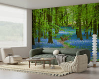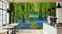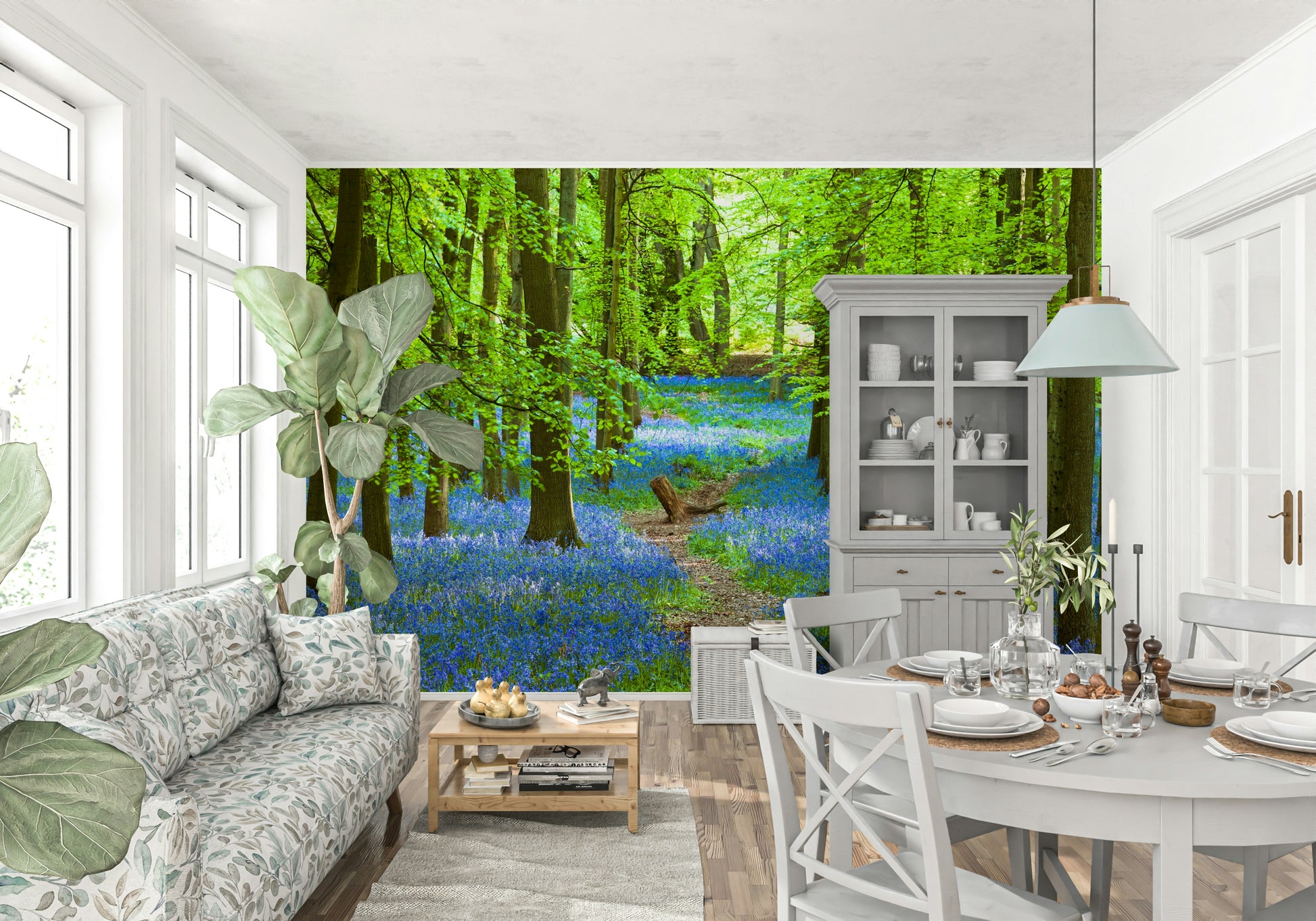 Path in Bluebell woods. Transform your space into a tranquil escape with 'Azure Pathway'. This captivating wall décor invites you to immerse yourself in the heart of a vibrant woodland. Towering trees, adorned with fresh, green foliage, cast dappled sunlight upon a breathtaking carpet of azure blue blossoms. A subtle, meandering pathway beckons, promising a journey of serenity and discovery. The contrast between the verdant canopy and the sea of blue creates a stunning visual harmony, imbuing your room with a sense of peace and natural beauty. Let 'Azure Pathway' transport you to a place of quiet contemplation, where the air is filled with the sweet fragrance of spring and the rustling leaves whisper tales of the forest.