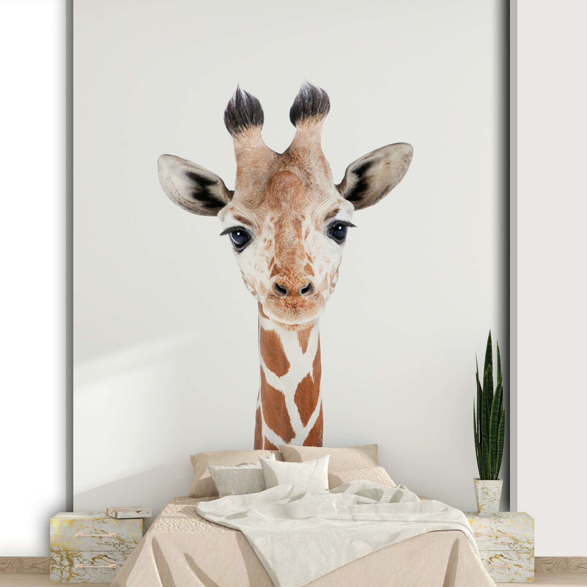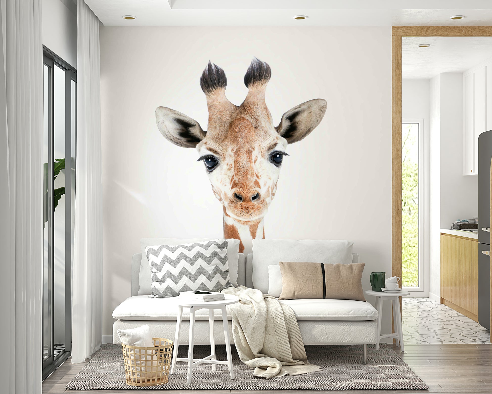 An adorable close-up of a baby giraffe's head and neck, set against a pristine white background. Its large, expressive eyes and soft, fuzzy coat are captivating. The intricate pattern of its iconic brown and white spots is beautifully detailed, highlighting the unique markings of this young creature. This wallpaper evokes feelings of warmth, innocence, and wonder, bringing the charm of the African savanna to your screen. Perfect for adding a touch of whimsical elegance and gentle beauty to your device.