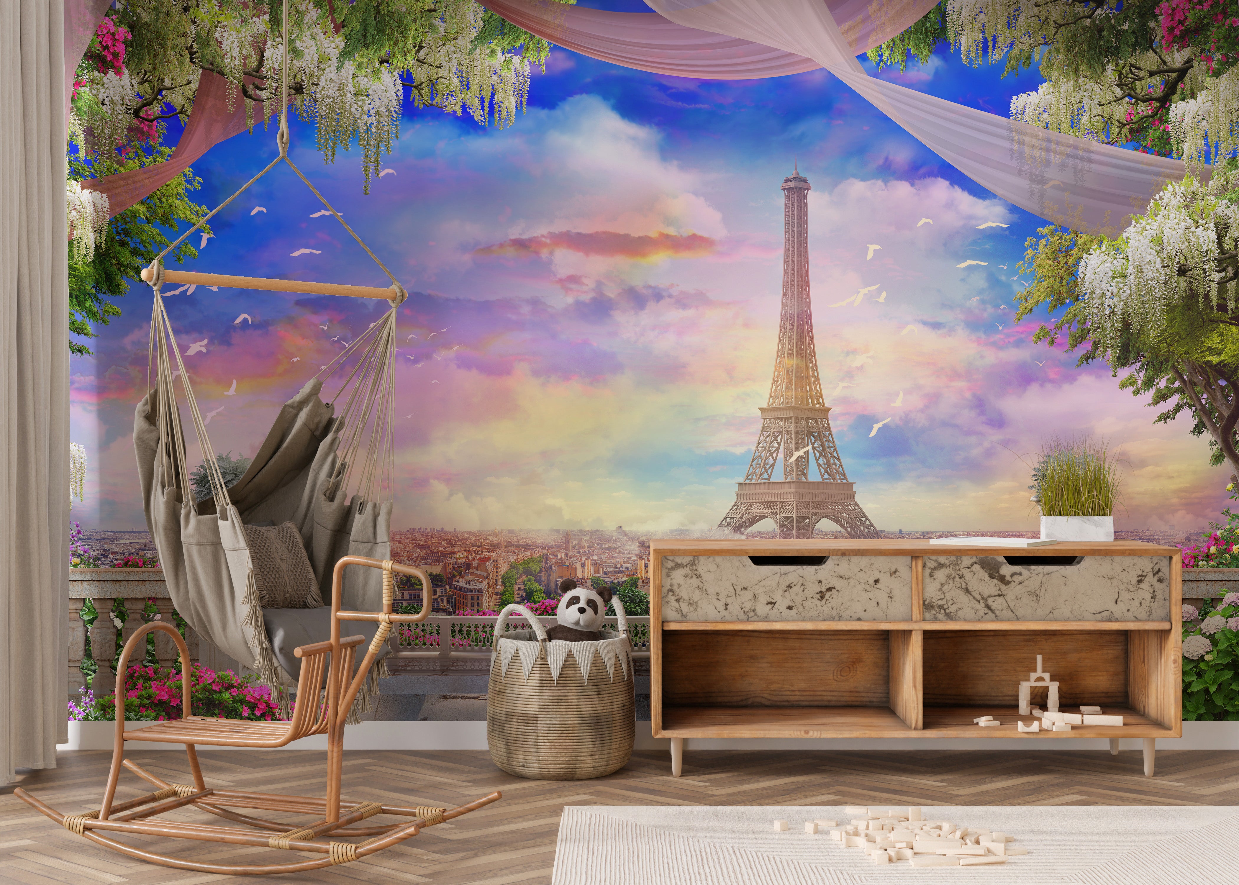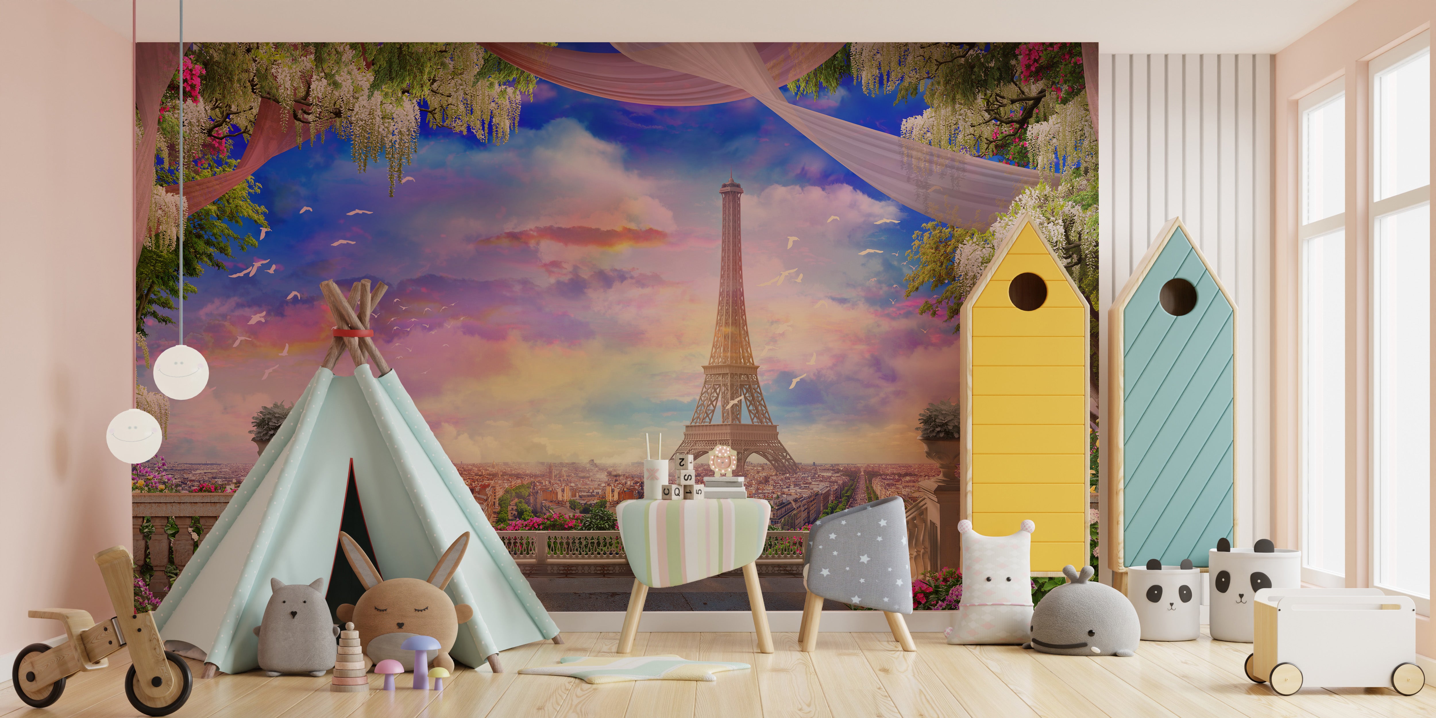 If you're looking to add a touch of European charm to your home, why not consider incorporating a Paris view into your decor? With a balcony Eiffel Tower sunset mural wallpaper, you can bring the romance of the City of Light into any room of your home. This playroom wallpaper is available in shades of pink and blue, making it a perfect choice for a childs bedroom or a playful accent wall. With a view of the iconic Eiffel Tower bathed in warm sunset hues, you'll feel like you've been transported to the heart of Paris every time you enter the room. So why wait? Add a touch of sophistication and elegance to your home today with our beautiful Paris view wallpaper.