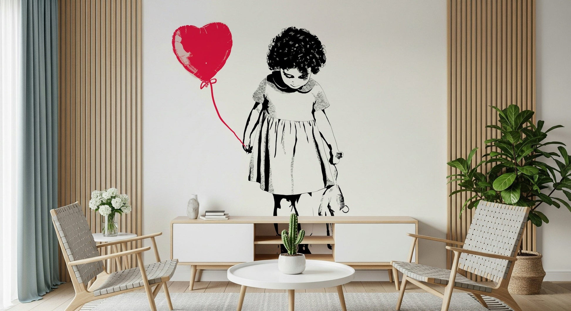 Bring a touch of poignant artistry to your walls with this monochrome wallpaper for walls. Featuring a stark, sketch-style depiction of a young girl and her heart-shaped balloon, this design adds a contemplative and subtle statement to any room. The limited palette of black, white, and a pop of bright red creates an intriguing focal point. This image enhances living spaces, bedrooms, and nurseries, bringing an element of childlike innocence and quiet reflection. It complements modern minimalist interiors or adds an intriguing touch to classic decor.