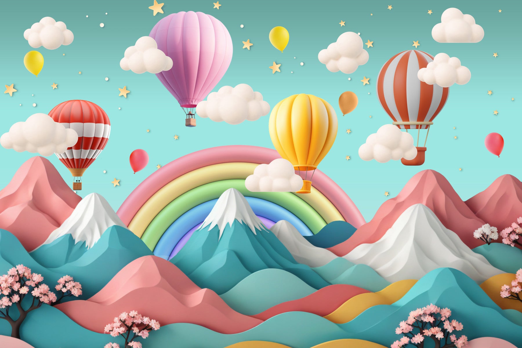Let your imagination soar with this whimsical balloon-filled landscape. The design features colorful hot air balloons floating above pastel mountains and a rainbow arch. The soft color palette of pinks, blues, yellows, and greens creates a soothing atmosphere. It is the perfect wallpaper for walls in a nursery, kids' room, or playroom. The cheerful scene brings a sense of wonder and elevates interior style.