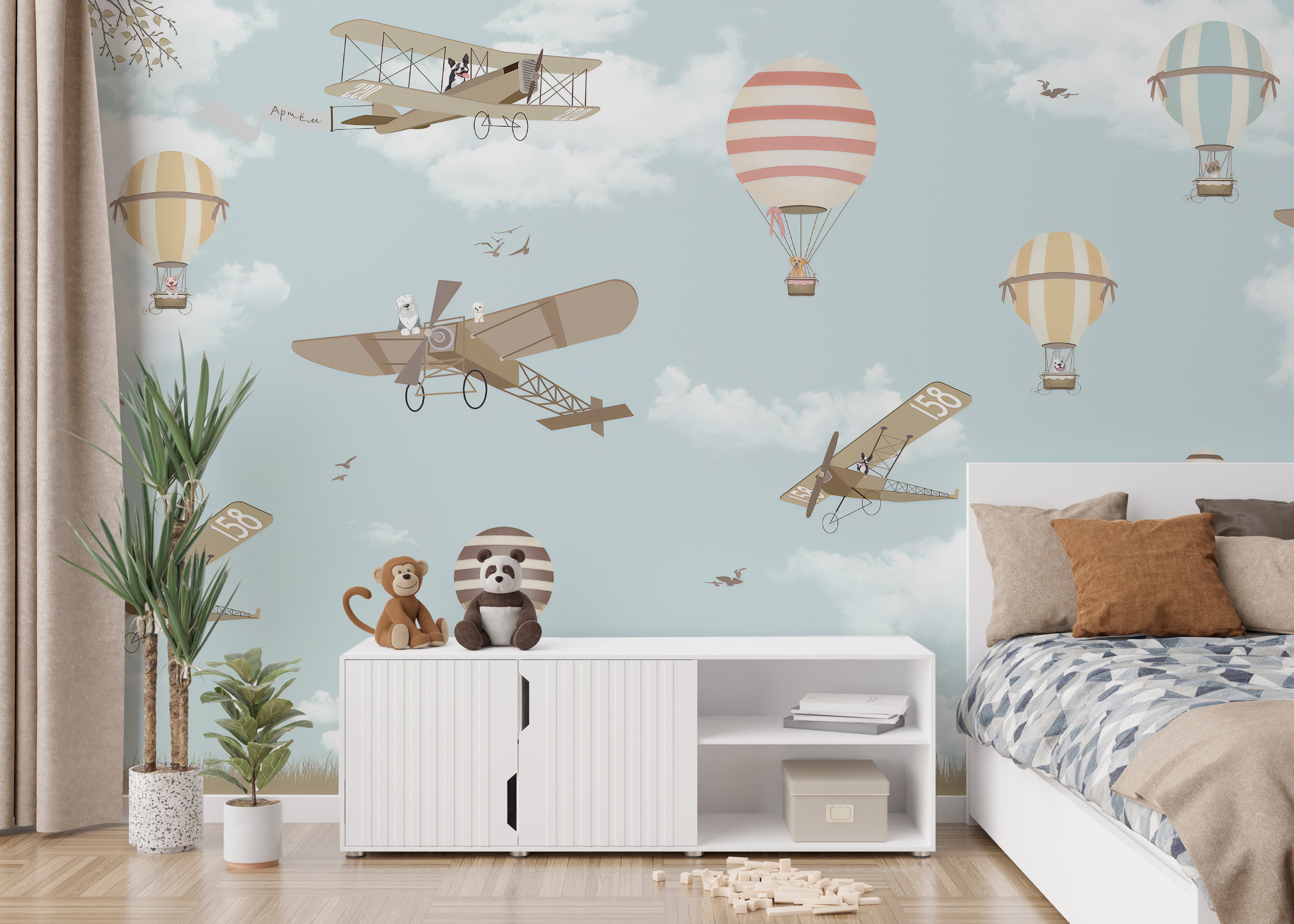 The thrill of taking to the skies is captured in the stunning hot air balloon and plane themed kids’ room mural wallpaper. Perfect for creating an adventurous atmosphere in any playroom or bedroom, this eye-catching wallpaper features vivid colors and intricate designs that ignite children's imaginations and transport them to a world of adventure and excitement. Whether you're looking to add a touch of whimsy or fuel your child's love for all things aviation, this wallpaper is sure to take your space to new heights. Bring the thrill of soaring through the clouds to your child's room with this fantastic wallpaper.