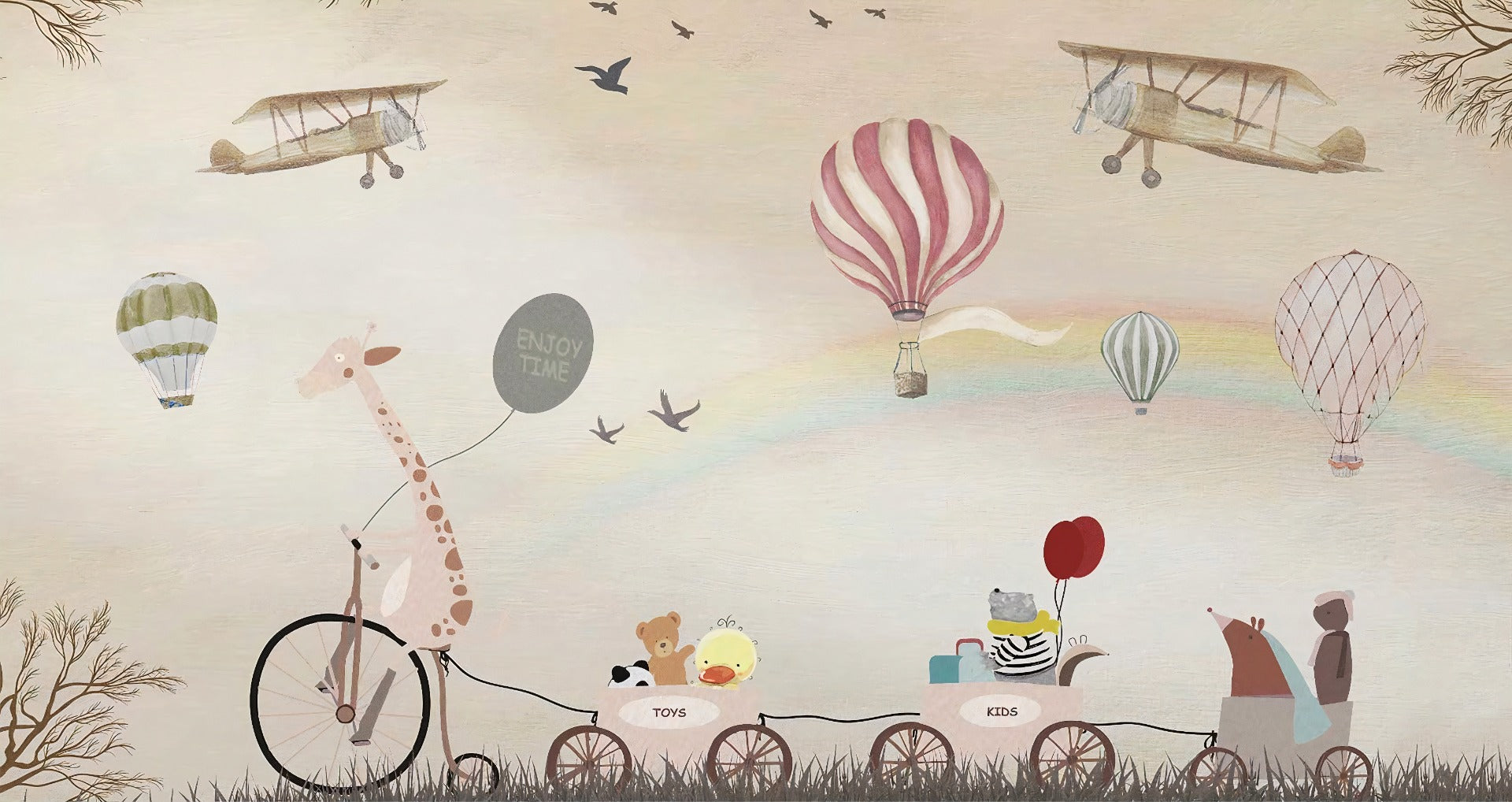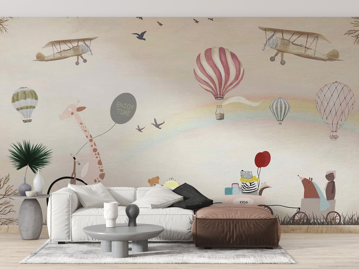 Step into a whimsical wonderland with our beige bliss jovial animals mural wallpaper. Perfect for your little ones' playroom, this wallpaper will transport your child's imagination to a world of furry friends and lively adventures. Our beige wallpaper is sprinkled with adorable animals, including mischievous monkeys and friendly giraffes, bringing a sense of joy to your space. Give your kids a room where they can let their imagination run wild with this enchanting wallpaper.