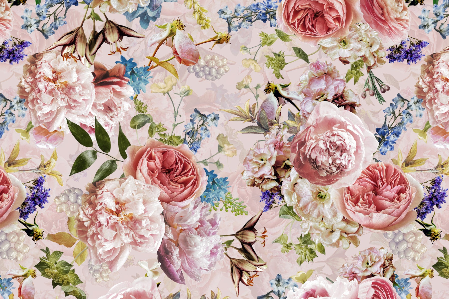 Step into a realm of opulent beauty with our Baroque Bold Pink Flower Garden wallpaper. This design by Uta Naumann captures the essence of Baroque grandeur, reimagined with a touch of contemporary flair. Lush, oversized pink roses and peonies take center stage, their velvety petals unfolding in a symphony of textures and tones. Interwoven with delicate blue accents and subtle greenery, the composition strikes a perfect balance between drama and serenity. The pink backdrop enhances the vibrancy of the floral arrangement, creating a warm and inviting ambiance. Perfect for adding a touch of romantic elegance to any space, this wallpaper transforms walls into works of art, evoking the feeling of strolling through a secret garden at the height of its bloom. Let the "Baroque Bold Pink Flower Garden" infuse your home with its timeless charm and sophisticated appeal.