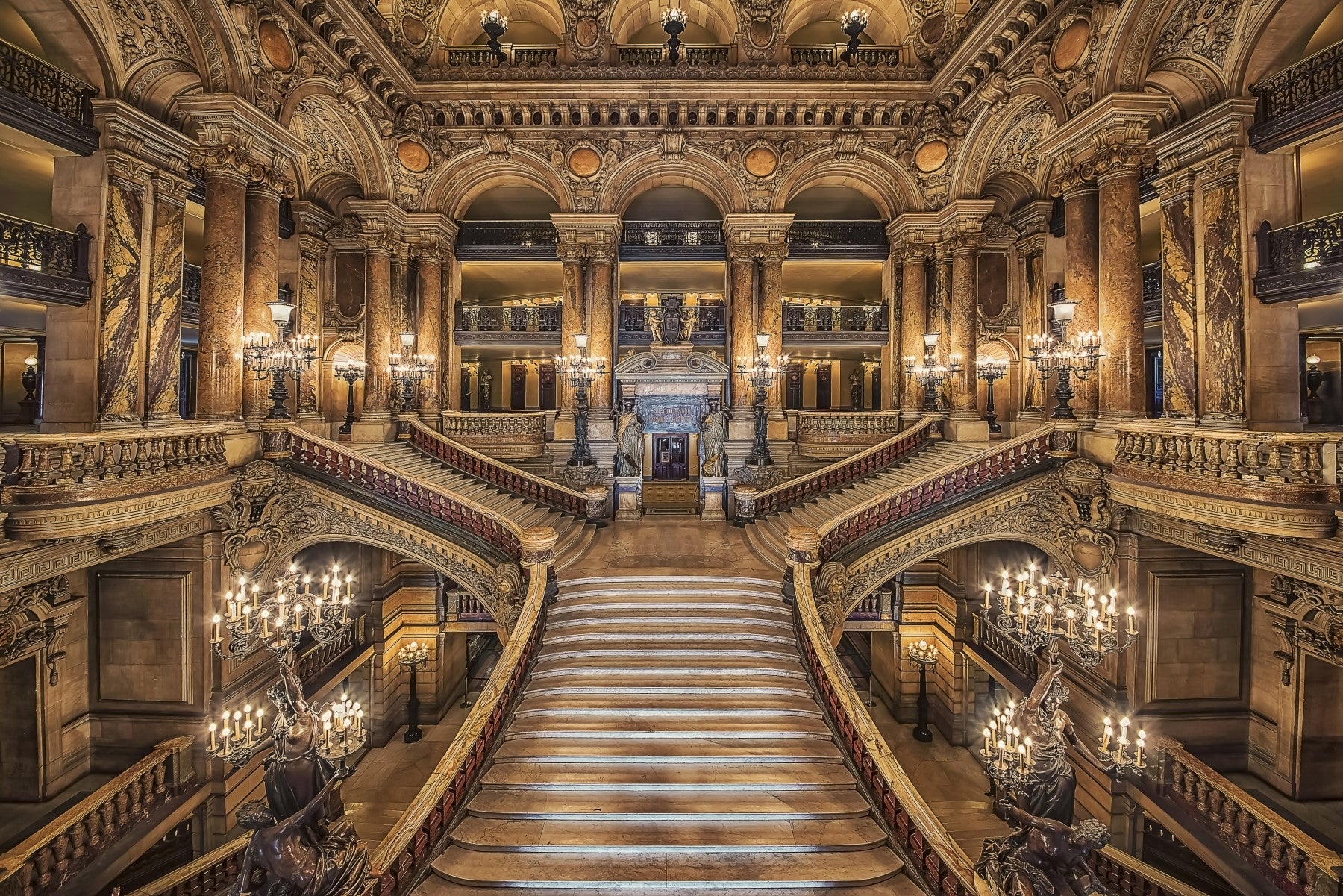 Elevate your space with a wallpaper that echoes timeless grandeur. The image showcases a majestic staircase framed by baroque detailing, marble accents, and glowing candelabras. Warm beige tones dominate the design, imparting a sense of old-world charm. This wallpaper for walls makes a statement in entryways, libraries, or home offices, enhancing interiors with an air of cultural richness. Opt for gold accents to complement its decadent style.
